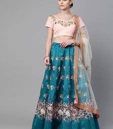 Turquoise blue & peach-coloured embroidered semi-stitched lehenga & unstitched blouse with dupatta