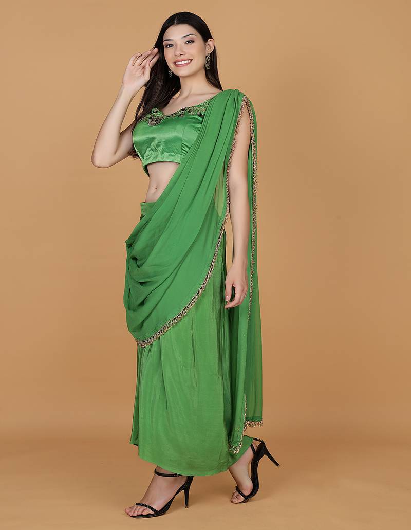 | Product Name | Leaf Green Crepe Embroidered Blouse With Crepe Drape Skirt And Georggette Drape Duppatta | |