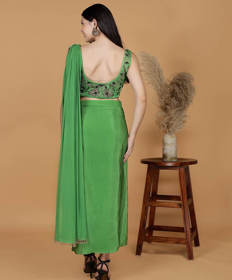 Leaf green crepe embroidered blouse with crepe drape skirt and georggette drape duppatta