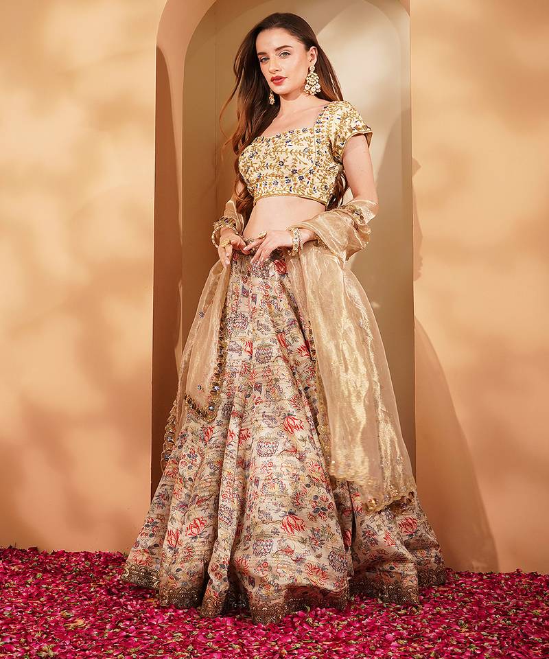 Light beige gicha silk printed lehenga set with hand embroidered blouse and dupatta
