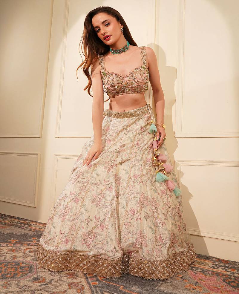 Light fawn gicha silk printed lehenga set with heavy hand embroidered blouse