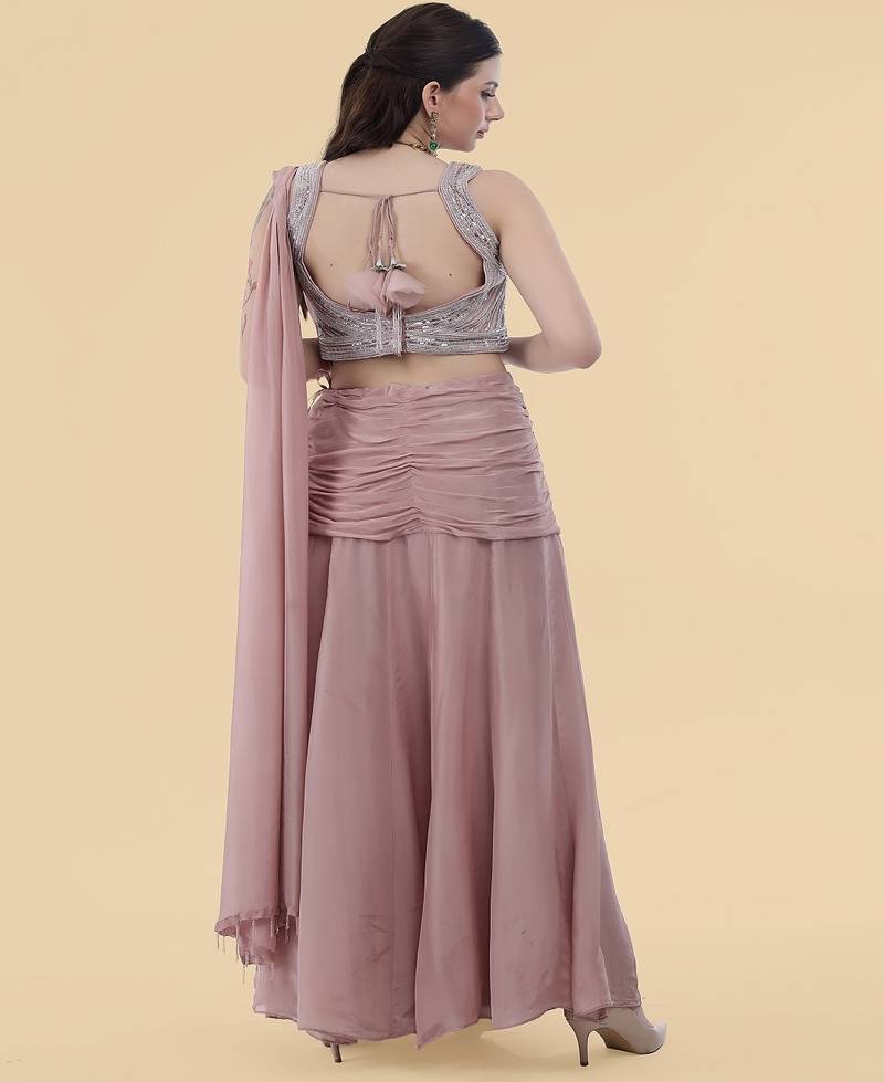 Onion pink crepe draped skirt set with embroidered blouse