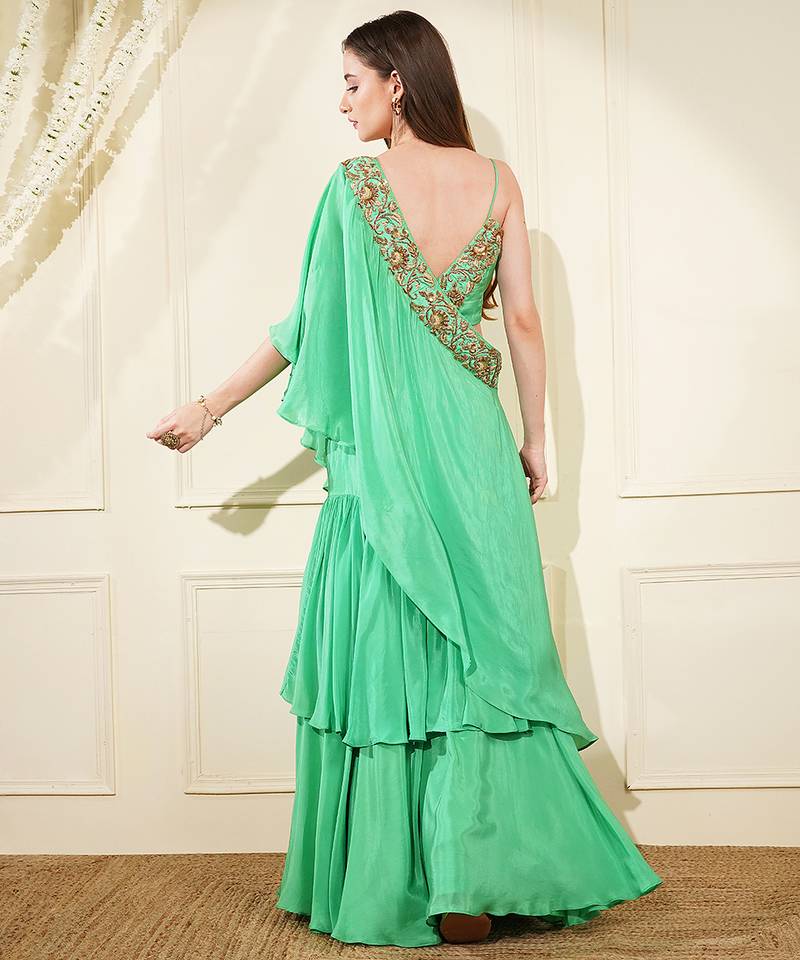 Sea green crepe layered flair fish skirt cape set with hand embrodiery