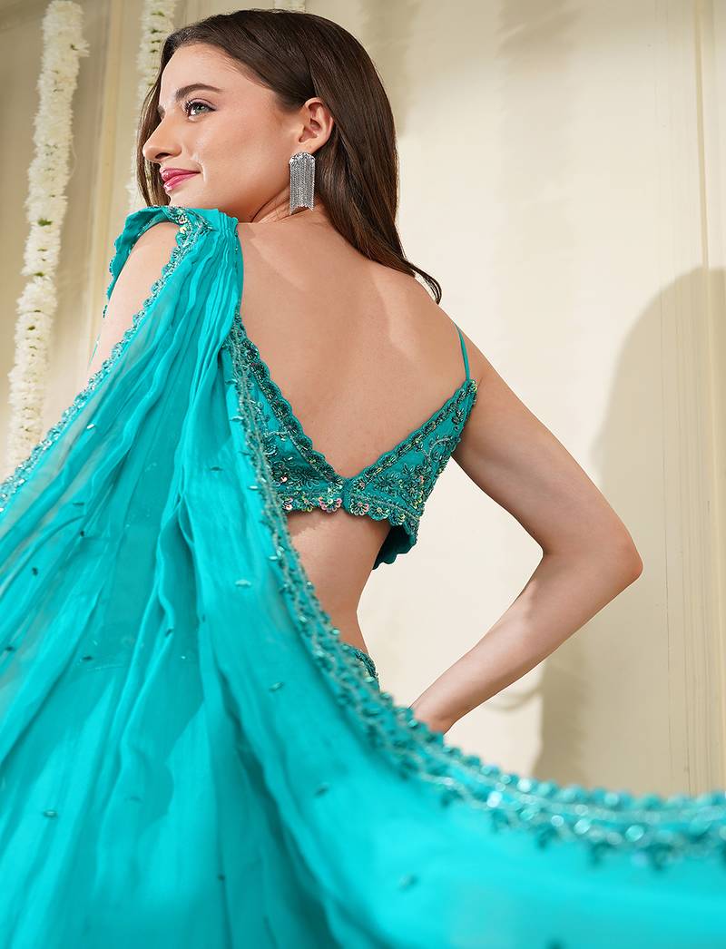 Teal green organza drape skirt set with hand work blouse and dupatta