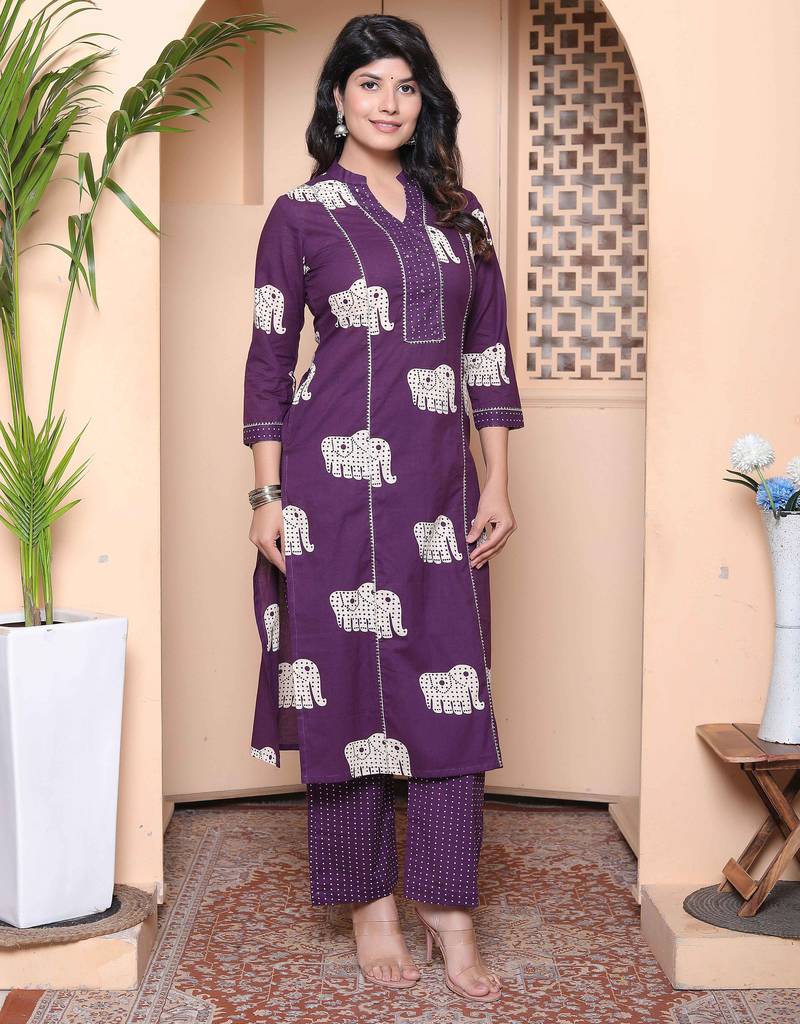 womens purple printed kurta with palazzo stitched