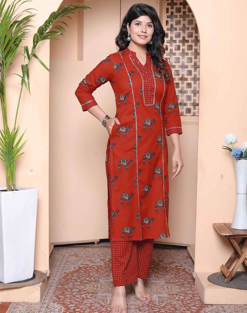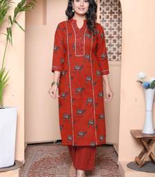 | Product Name | Womens Rust Animal Printed Three Quarter Sleeves Pure Cotton Kurta With Palazzo | |