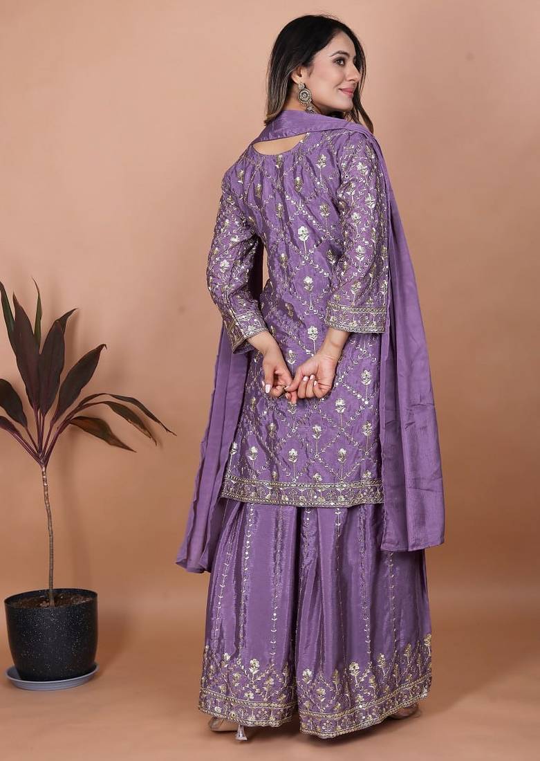 Light purple chinon silk party wear embroidery sharara suit stitched