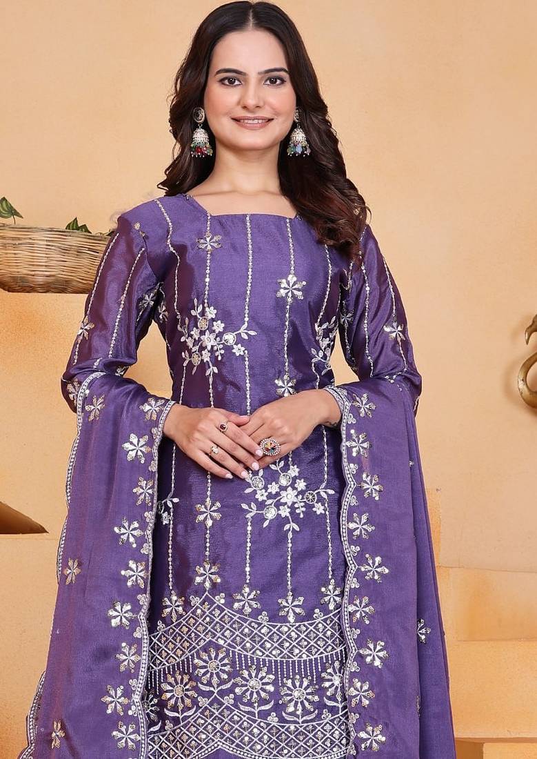 | Product Name | Light Purple Chinon Silk Party Wear Embroidery Sharara Suit | |