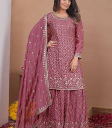 Peach chinon silk party wear embroidery sharara suit set stitched