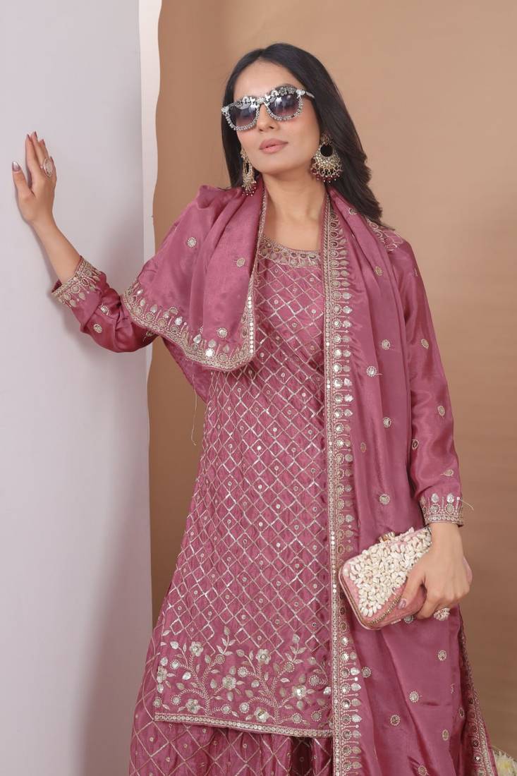 | Product Name | Peach Chinon Silk Party Wear Embroidery Sharara Suit Set | |