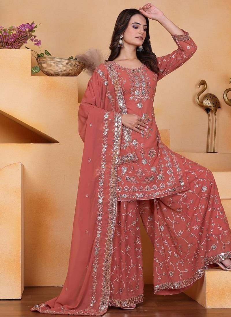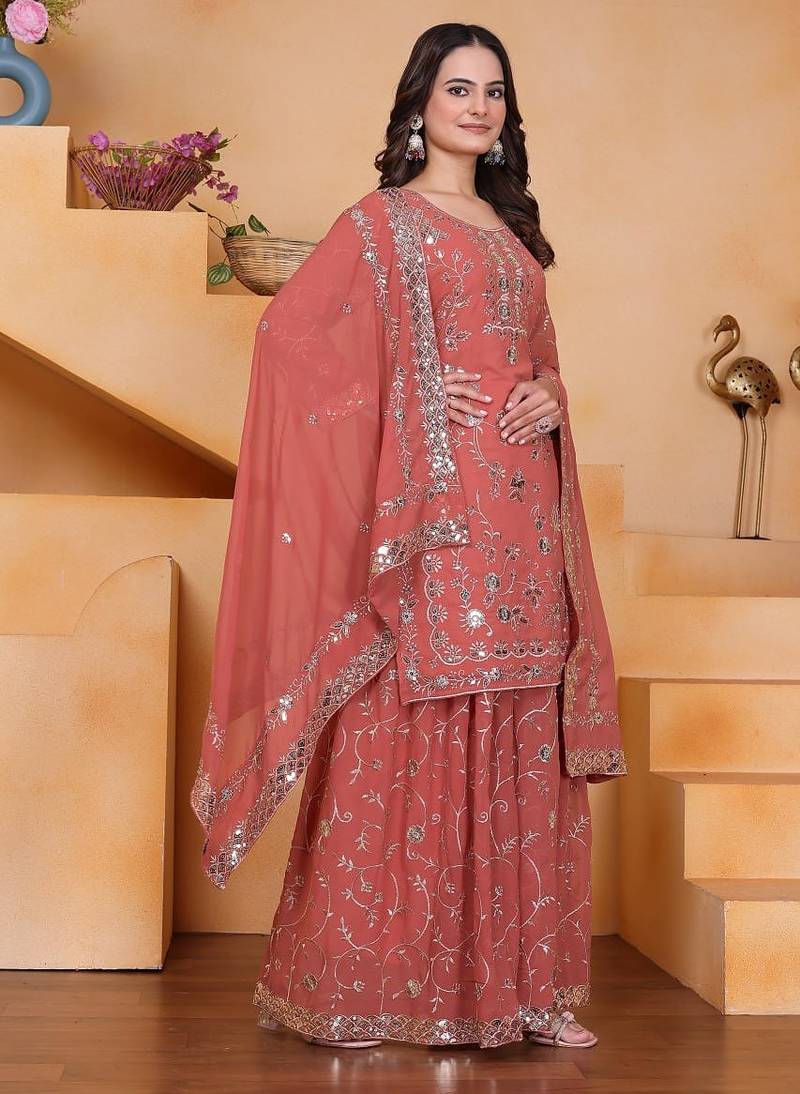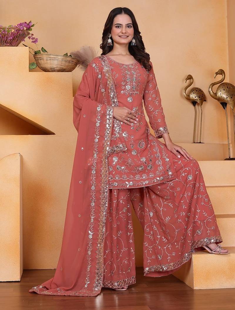 | Product Name | Peach Georgette Party Wear Embroidery Sharara Suit Set | |