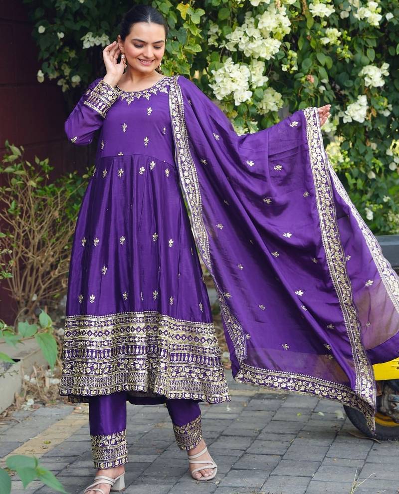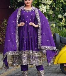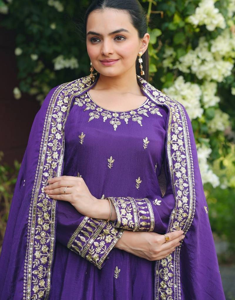 Purple chinon silk party wear embroidery sharara suit stitched