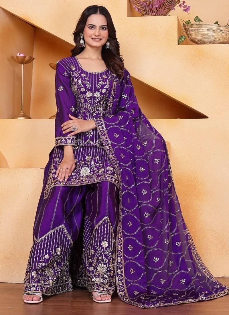 | Product Name | Purple Chinon Silk Party Wear Embroidery Sharara Suit Set | |