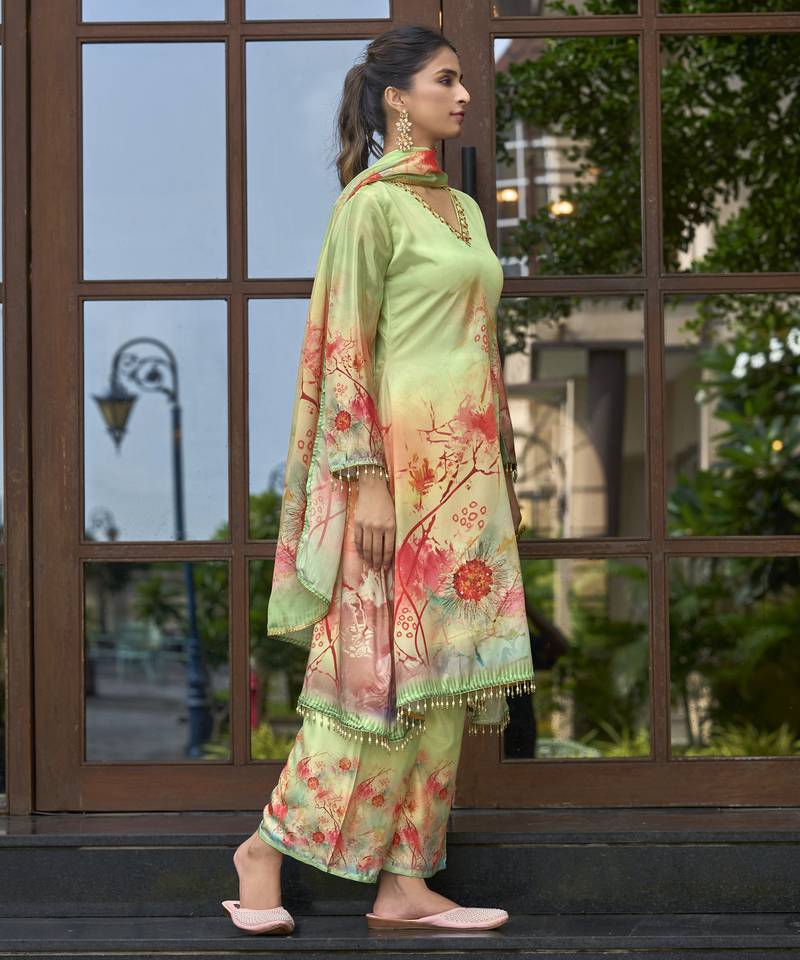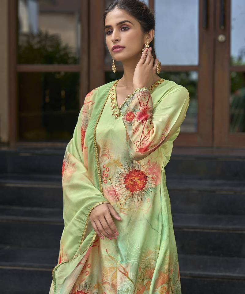 Product Name | Green Chinon Chiffon Floral Printed A Line Kurta With Palazzo & Printed Dupatta | |