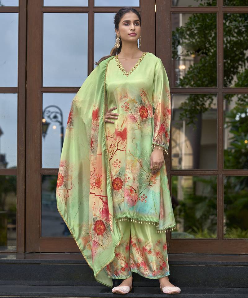 Product Description | Refreshing Green Chinon Chiffon Set Featuring A Floral Printed Calf Length Kurta Beautifully Adorned With Mirror Work And Delicate Bead Embellishments. Paired With A Fully Elasticated Printed Palazzo And A Matching Chinon Chiffon Printed Dupatta With Lace Border, This Ensemble Exudes Elegance And Comfort. Perfect For Festive Occasions, Parties, And Celebrations, It Adds A Touch Of Graceful Charm To Your Ethnic Wardrobe. |