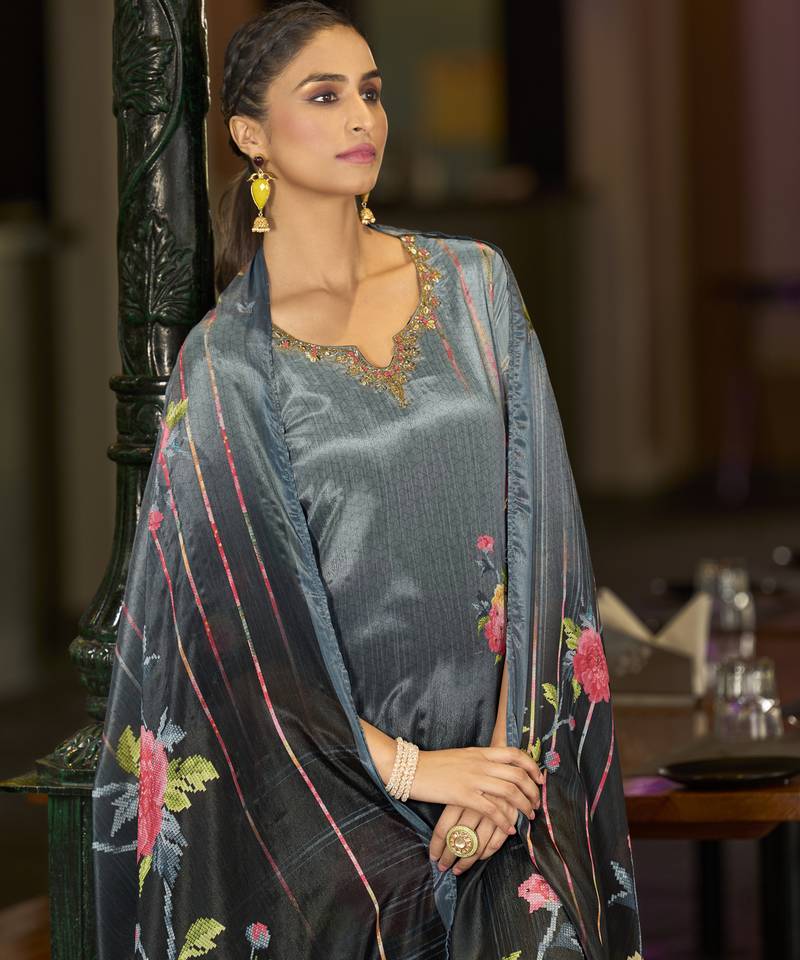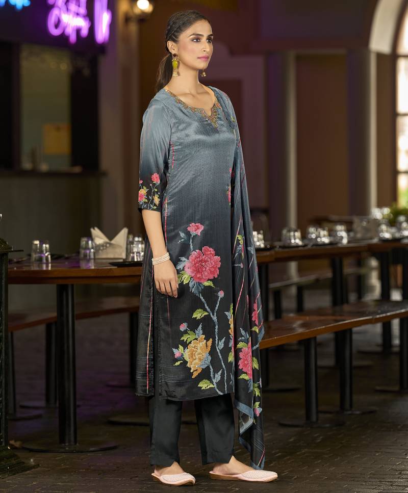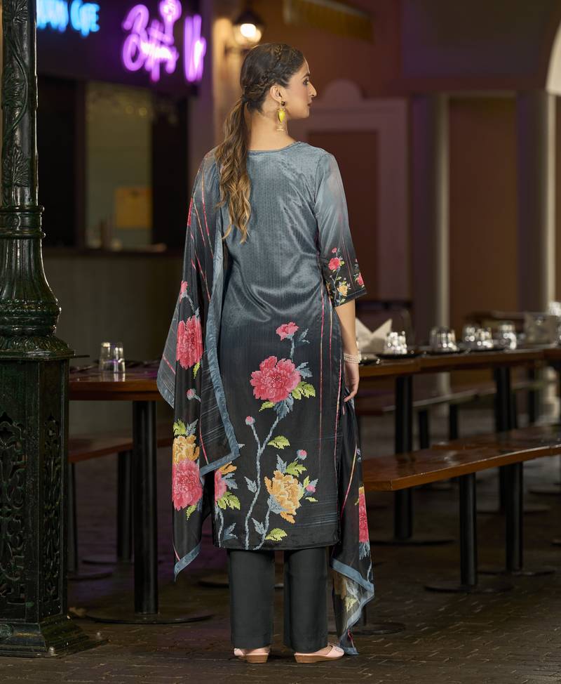 Product Name | Grey Chinon Chiffon Floral Printed Straight Kurta With Comfort Fitting Pant & Printed Dupatta | |