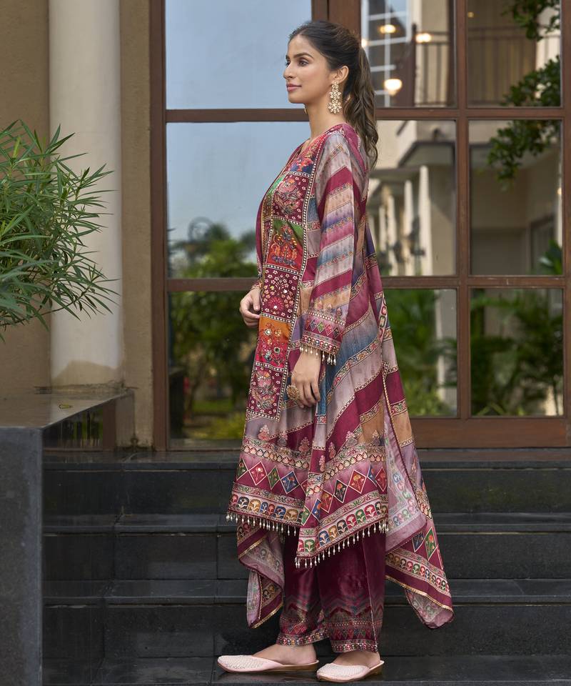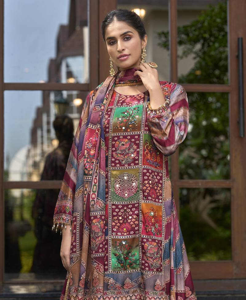 Product Name | Maroon Chinon Chiffon Floral Printed A Line Kurta With Palazzo & Printed Dupatta | |