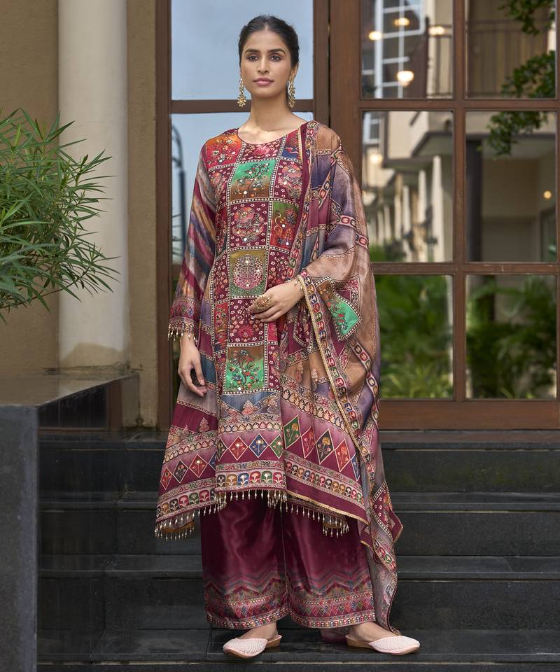 Product Description | Rich Maroon Chinon Chiffon Set Featuring A Floral Printed Calf Length Kurta Embellished With Mirror Work And Delicate Bead Detailing. Paired With A Fully Elasticated Printed Palazzo And A Matching Chinon Chiffon Printed Dupatta With Lace Border, This Ensemble Blends Elegance With Comfort. Perfect For Festive Occasions, Parties, And Celebrations, It Adds Timeless Charm And Sophistication To Your Ethnic Wardrobe. |