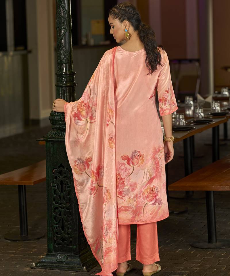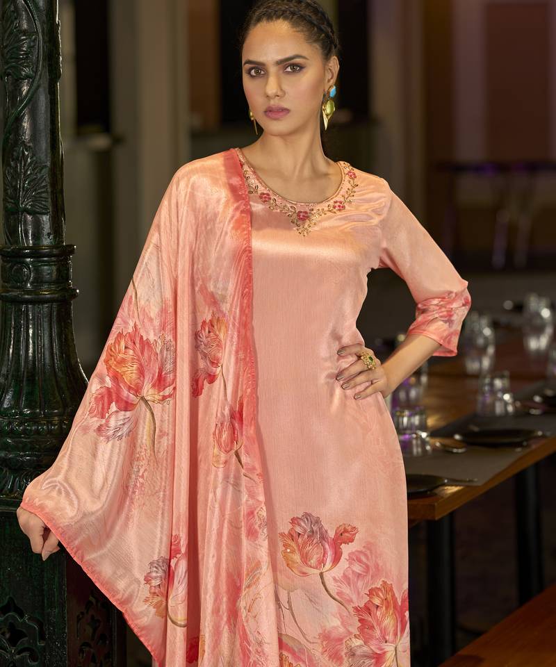 Product Name | Peach Chinon Chiffon Floral Printed Straight Kurta With Comfort Fitting Pant & Printed Dupatta | |