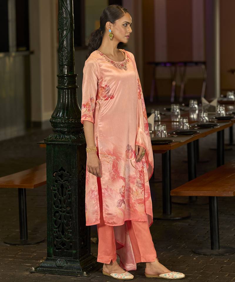 Product Description | Elevate Your Ethnic Style With This Peach Chinon Chiffon Floral Printed Straight Kurta, Embellished With Beads, Sequins, And Kantha Work. Designed With A Soft Cotton Lining, It Pairs Effortlessly With Pure Shantoon Partially Elasticated Solid Comfort Fitting Pant And A Matching Printed Dupatta. Perfect For Festive Occasions, Parties, Or Outingwear, This Ensemble Combines Charm, Elegance, And Comfortable Wearability. |