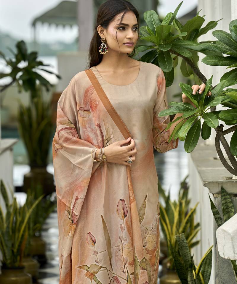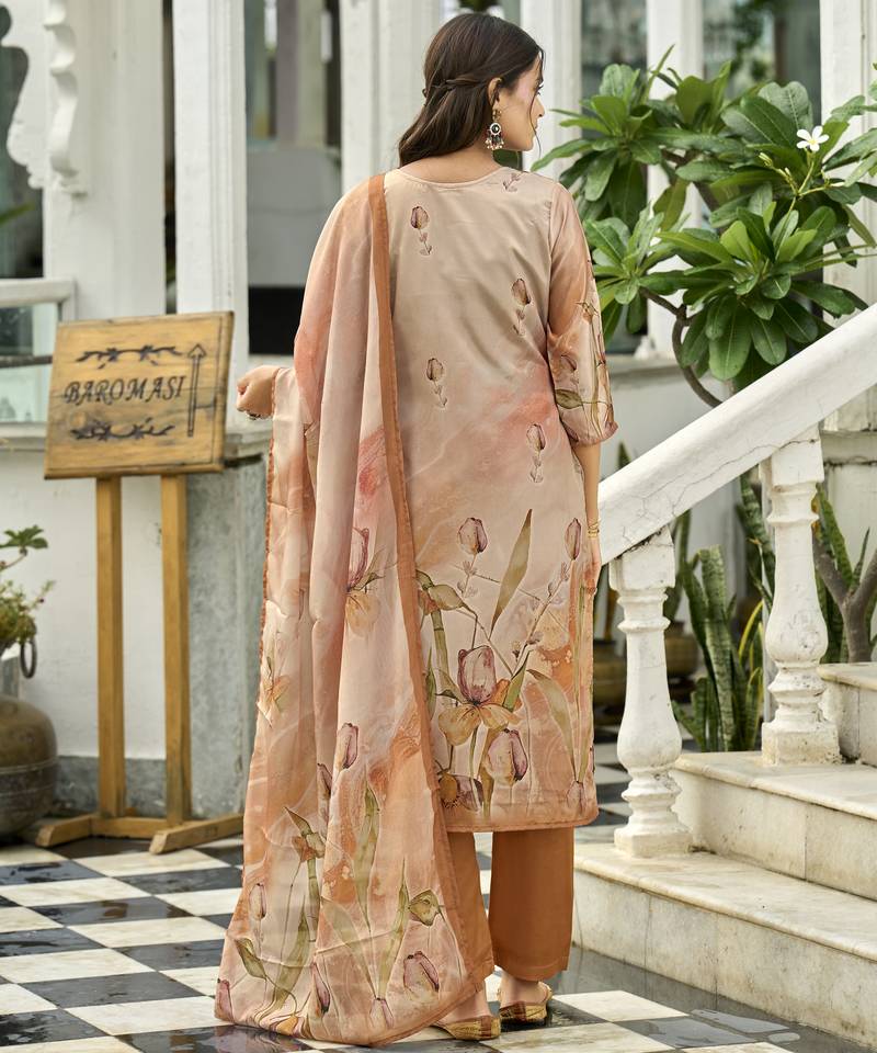 Product Name | Peach Ho Organza Floral Printed Straight Kurta With Pant & Printed Dupatta | |