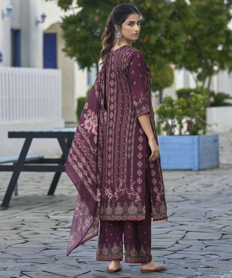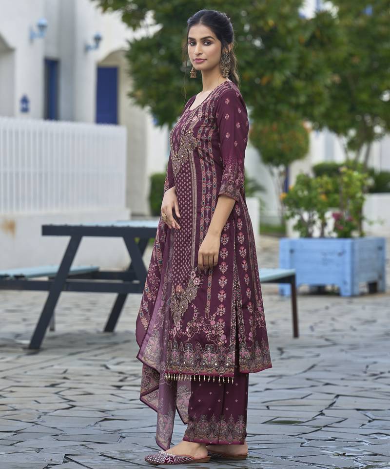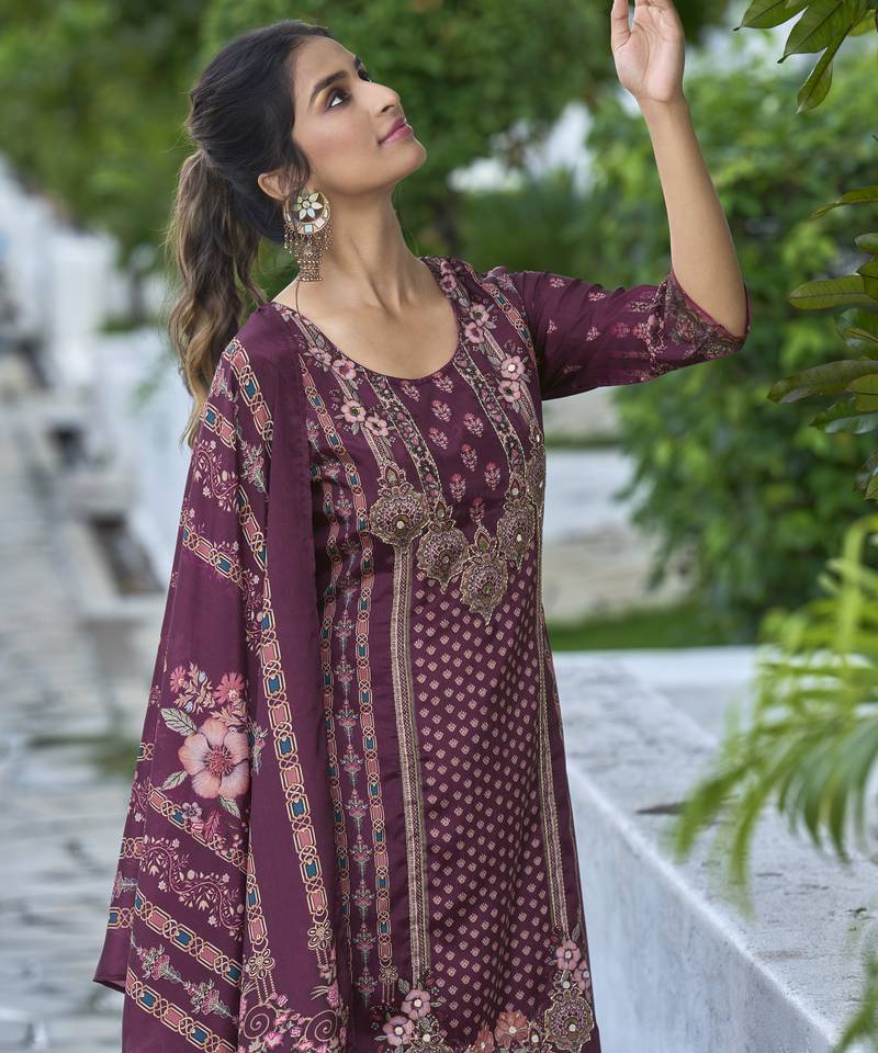 Product Name | Purple Chinon Chiffon Abstract Printed Straight Kurta With Palazzo & Printed Dupatta | |
