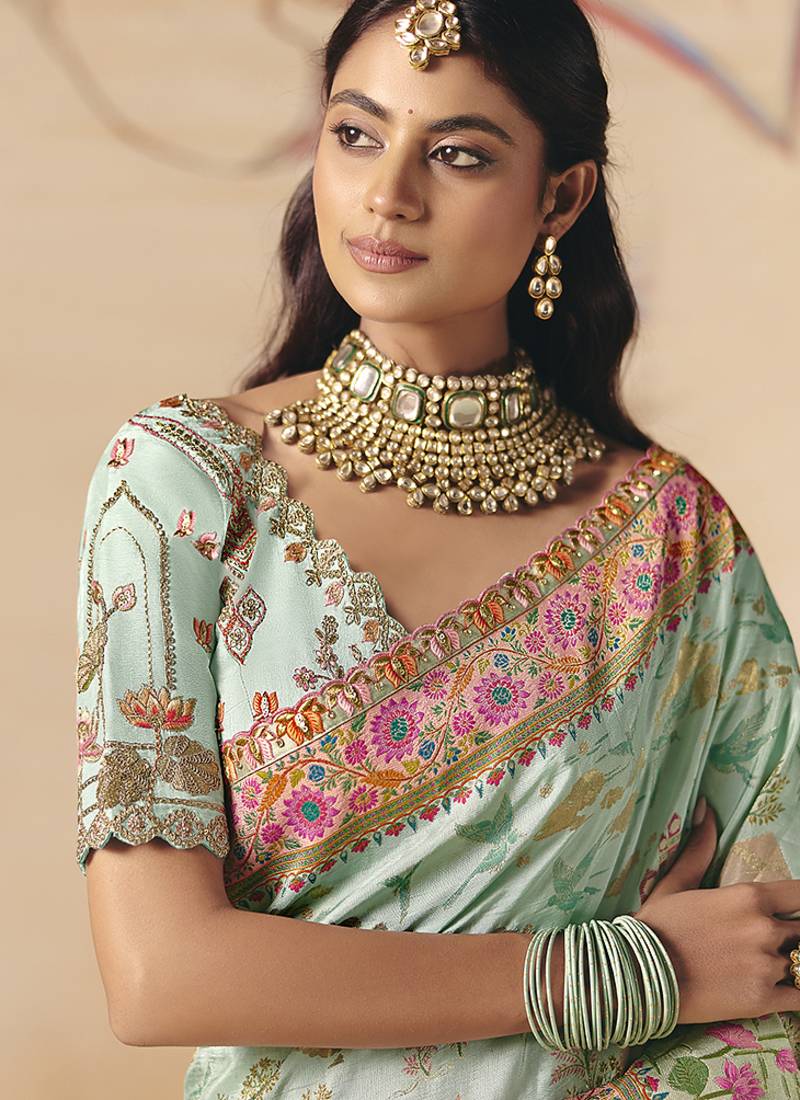 Aqua blue embroidered silk blend saree