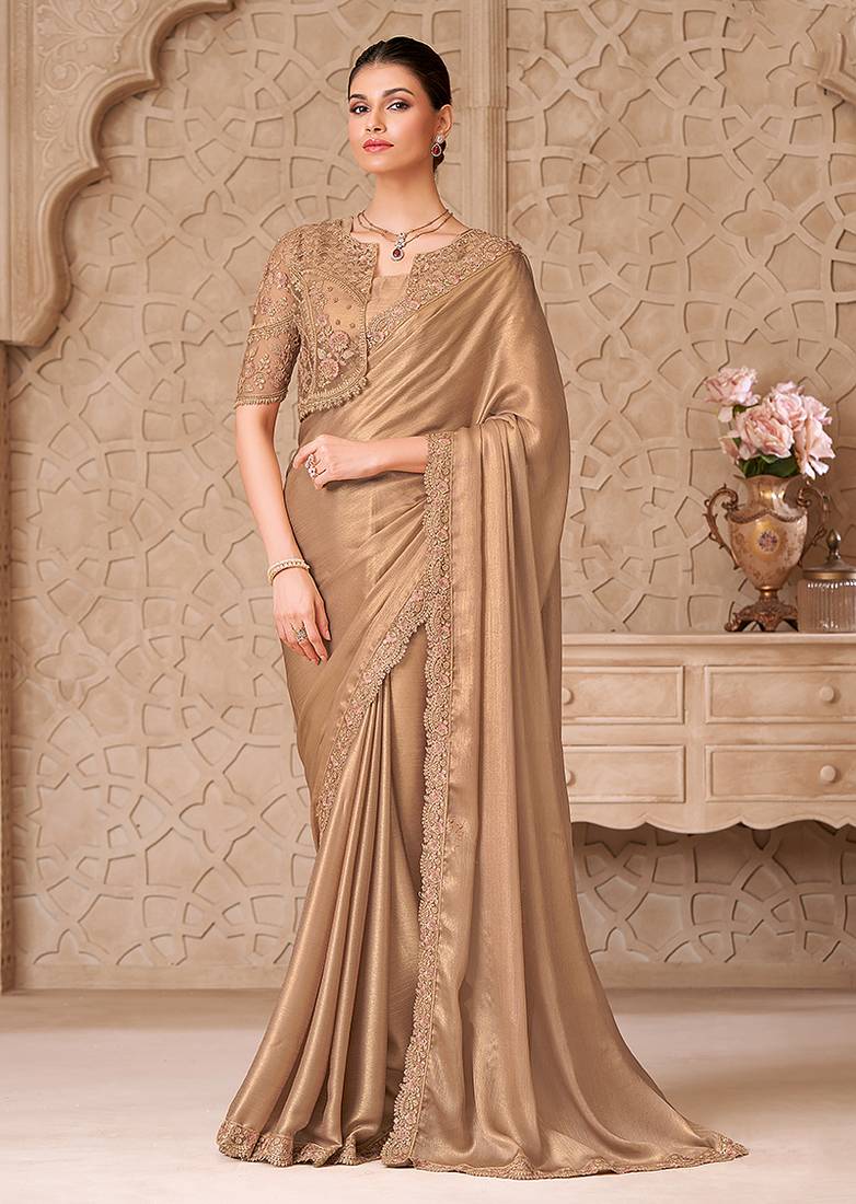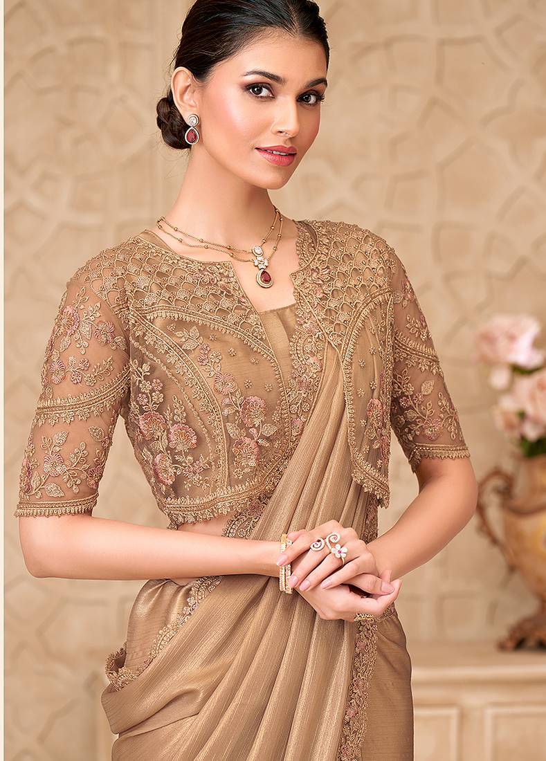 Product Name Beige Shimmer Satin Georgette Fancy Designer Saree With Jacket Style Blouse