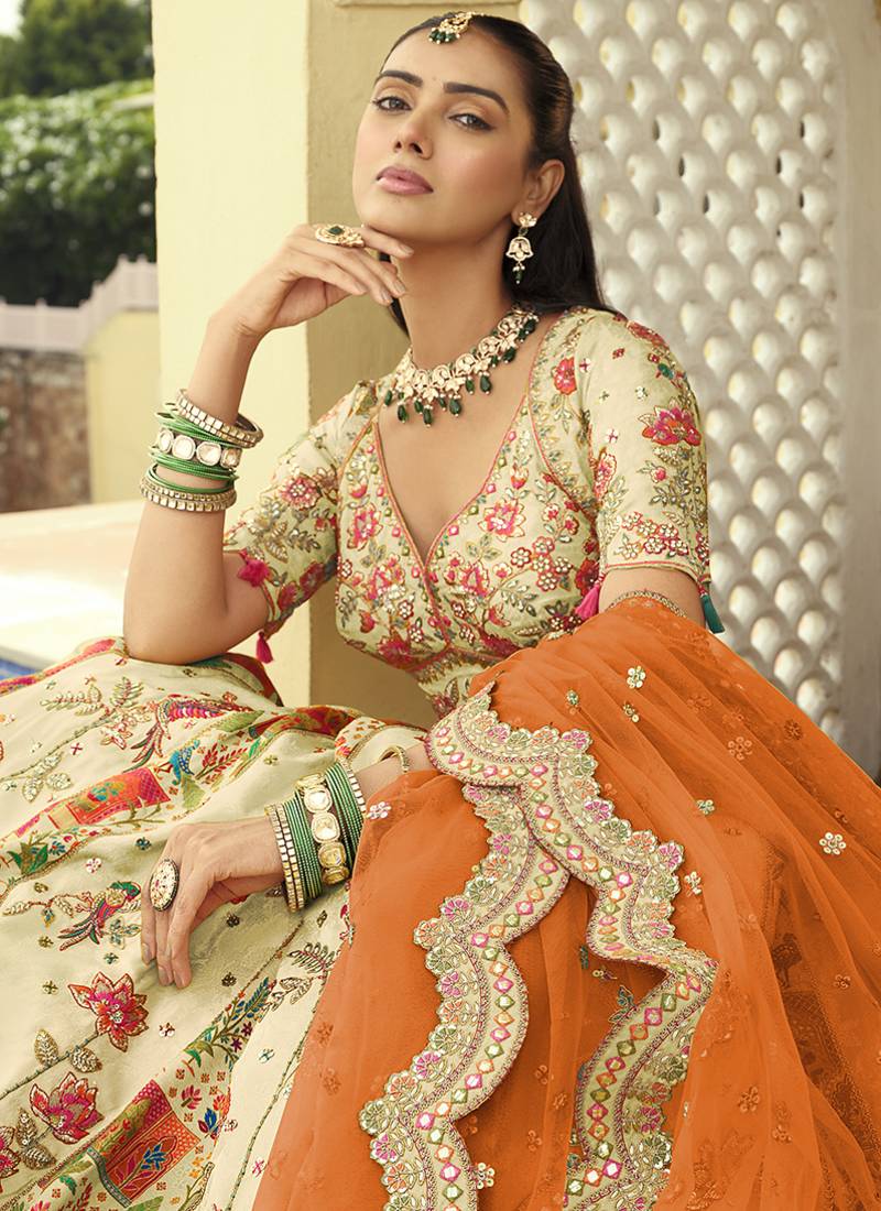 | Product Name | Cream Art Silk With Embroidered Cut Work Readymade Bridal Lehenga Choli Full Stitched Free Size | |