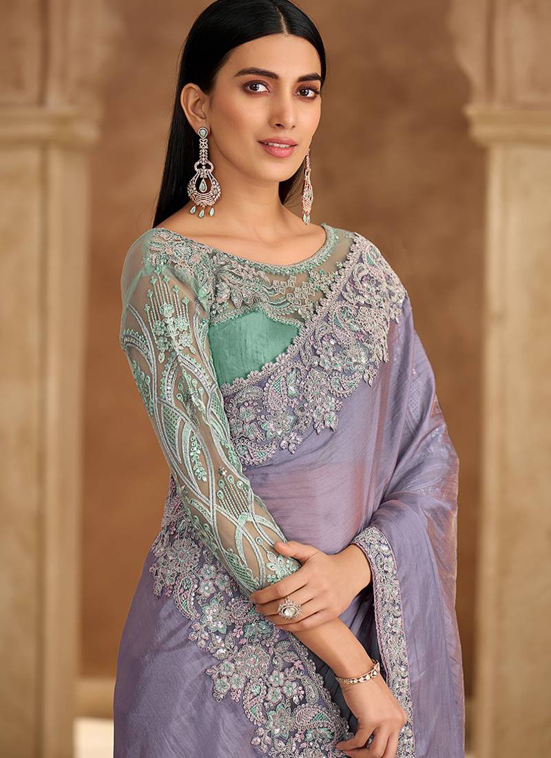Embroidered faux chiffon lavender saree