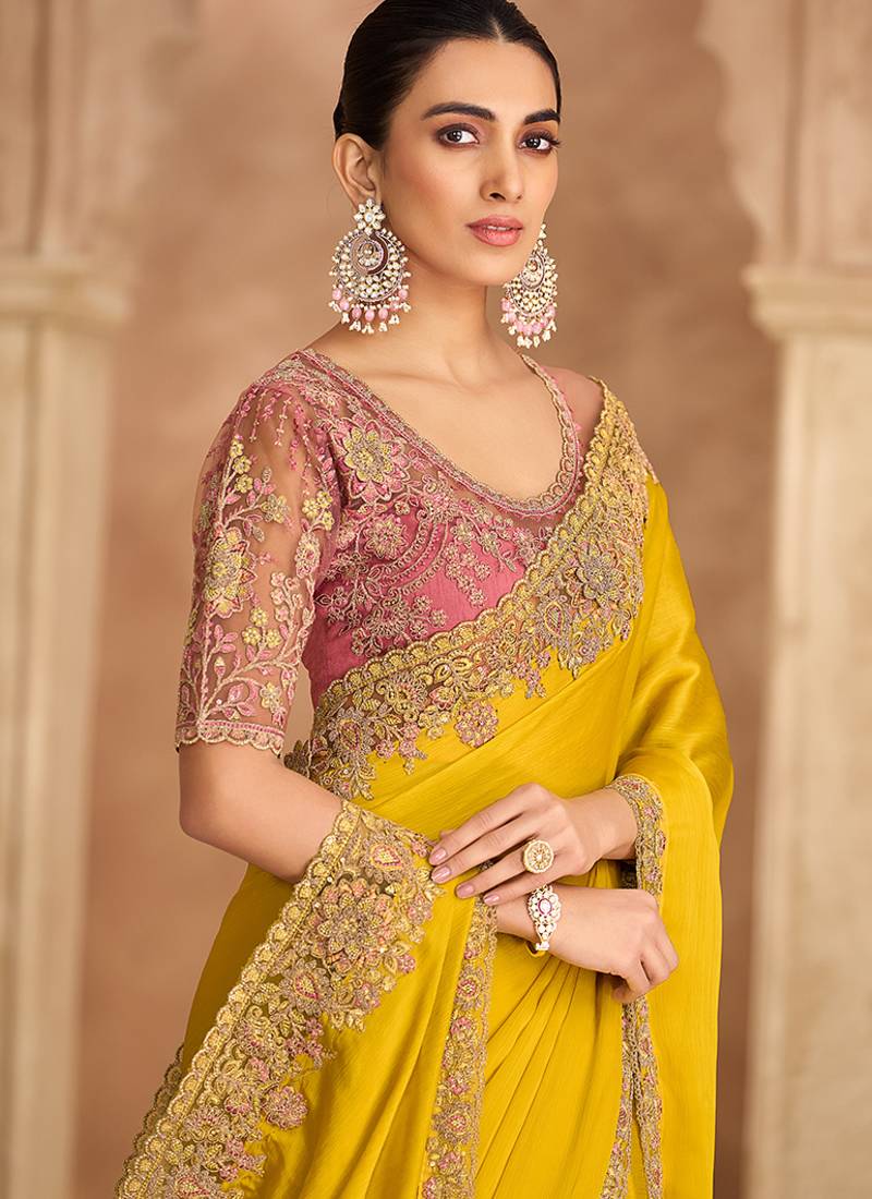 This Yellow Faux Chiffon Satin Traditional Saree Is Accenting The Gorgeous Feeling. The Border And Embroidered Work Looks Chic And Perfect For Any Occasion. Comes With Unstiched Blouse. (Slight Variation In Color, Fabric & Work Is Possible. Model Images Are Only Representative.)