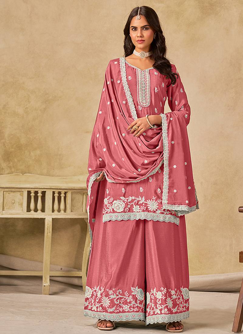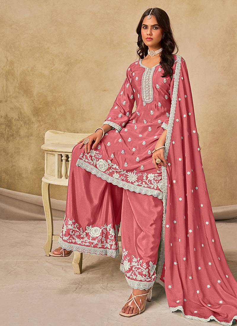 Embroidered pink chinon silk palazzo salwar suit semi stitched