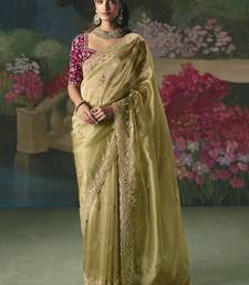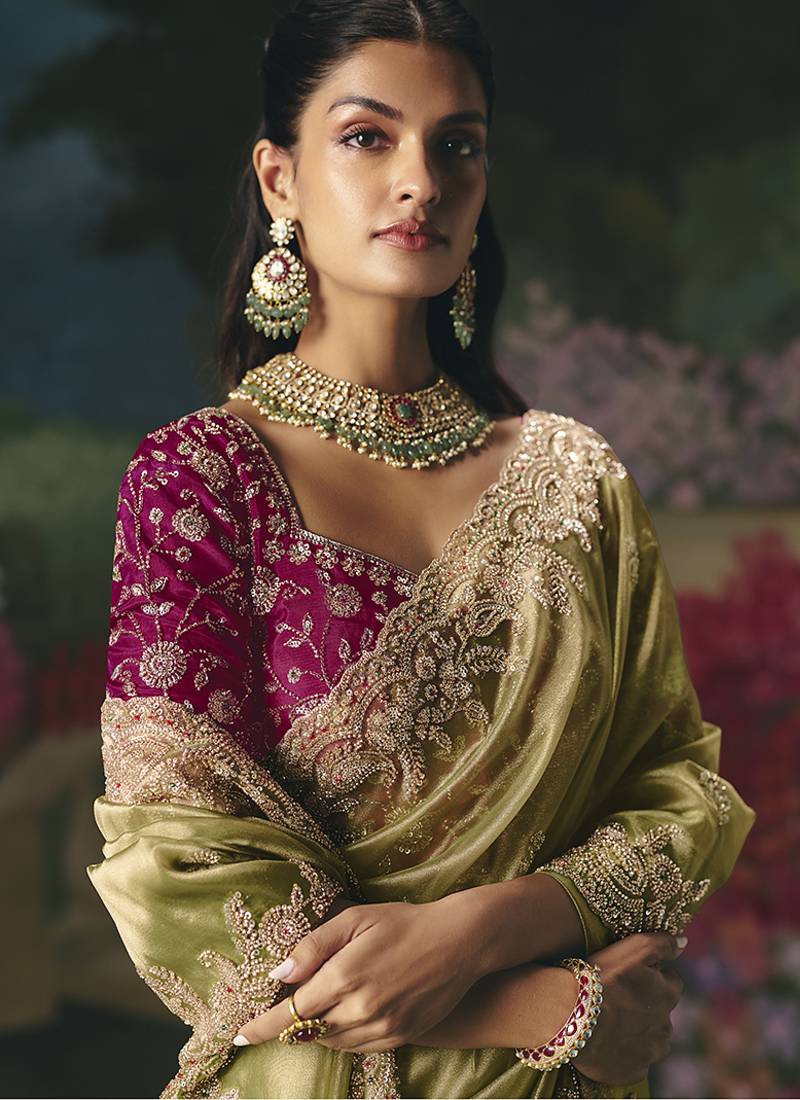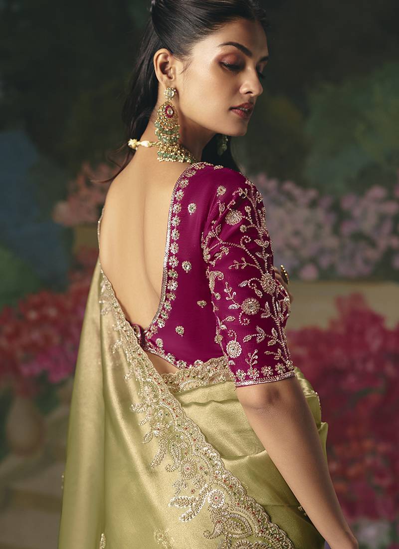 Fancy fabric embroidered saree in pista green