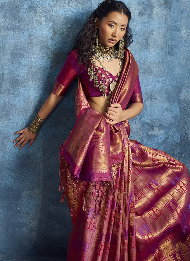 Be An Angel And Create And Establish A Smashing Affect On Everybody By Wearing This Pink Handloom Silk Blend Classic Saree. The Ethnic Weaving Work To Your Clothing Adds A Sign Of Magnificence Statement With Your Look. Comes With Matching Blouse. (Slight Variation In Color, Fabric & Work Is Possible. Model Images Are Only Representative.)