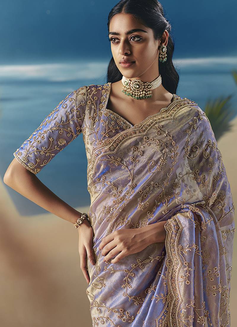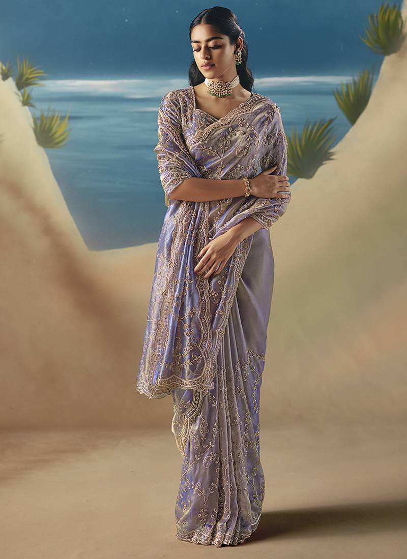 Be An Angel And Create And Establish A Smashing Impression On Anyone By Wearing This Lavender Color Fancy Fabric Classic Saree. This Enticing Attire Is Showing Some Remarkable Embroidery Done With Embroidered Sequince And Stone Work. Comes With Matching Blouse. (Slight Variation In Color, Fabric & Work Is Possible. Model Images Are Only Representative.)