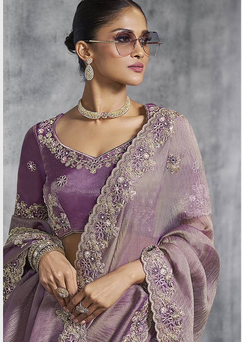 Mauve tissue traditional saree with embroidered, resham and thread work for ceremonial