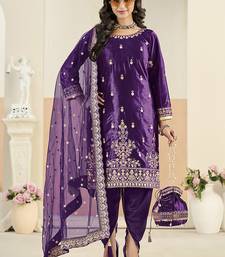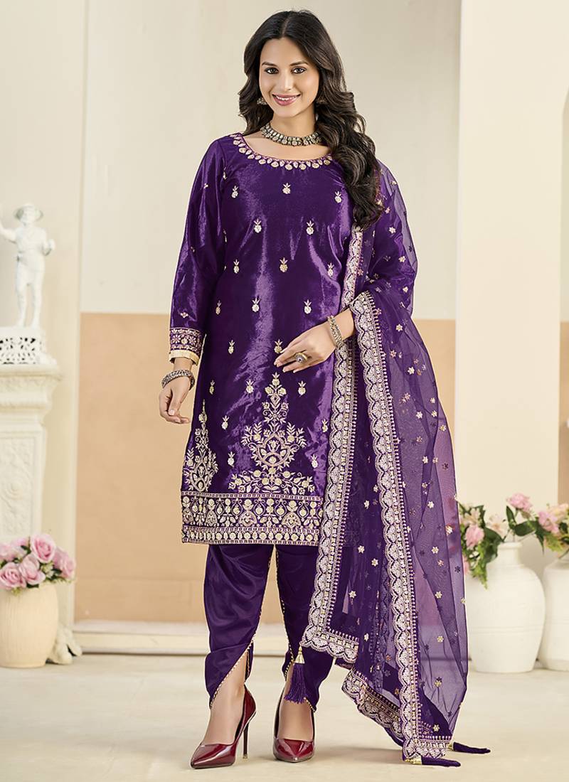 Purple velvet embroidered salwar kameez with patiala bottom semi stitched