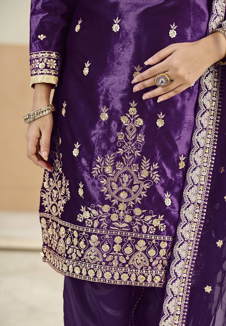 The Purple Velvet Embroidered Salwar Kameez Features A Rich Purple Velvet Kameez Adorned With Intricate Resham And Sequins Embroidery. Designed With A Round Neck And Quarter Sleeves, It Is Paired With A Matching Purple Patiala Bottom And Coordinating Dupatta, Creating A Harmonious And Traditional Silhouette. Crafted As A Semi Stitched Outfit, It Allows For Tailored Adjustments While Maintaining Refined Proportions. The Luxurious Velvet Fabric And Detailed Embellishments Provide Texture And Festive Appeal, Making It Suitable For Weddings, Cultural Events, And Formal Gatherings. This Salwar Kameez Blends Traditional Craftsmanship With Contemporary Styling, Offering An Elegant And Polished Ethnic Outfit With Versatile Wear.