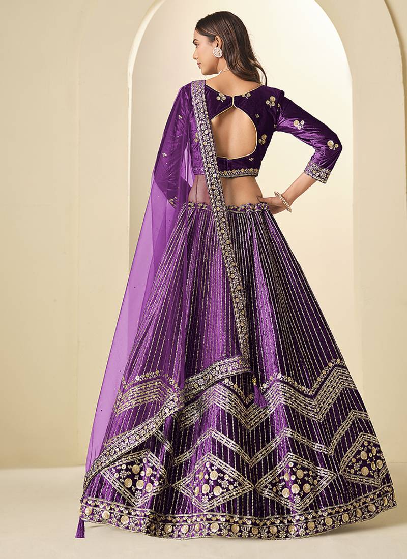 Purple velvet embroidered sequins work a line lehenga choli