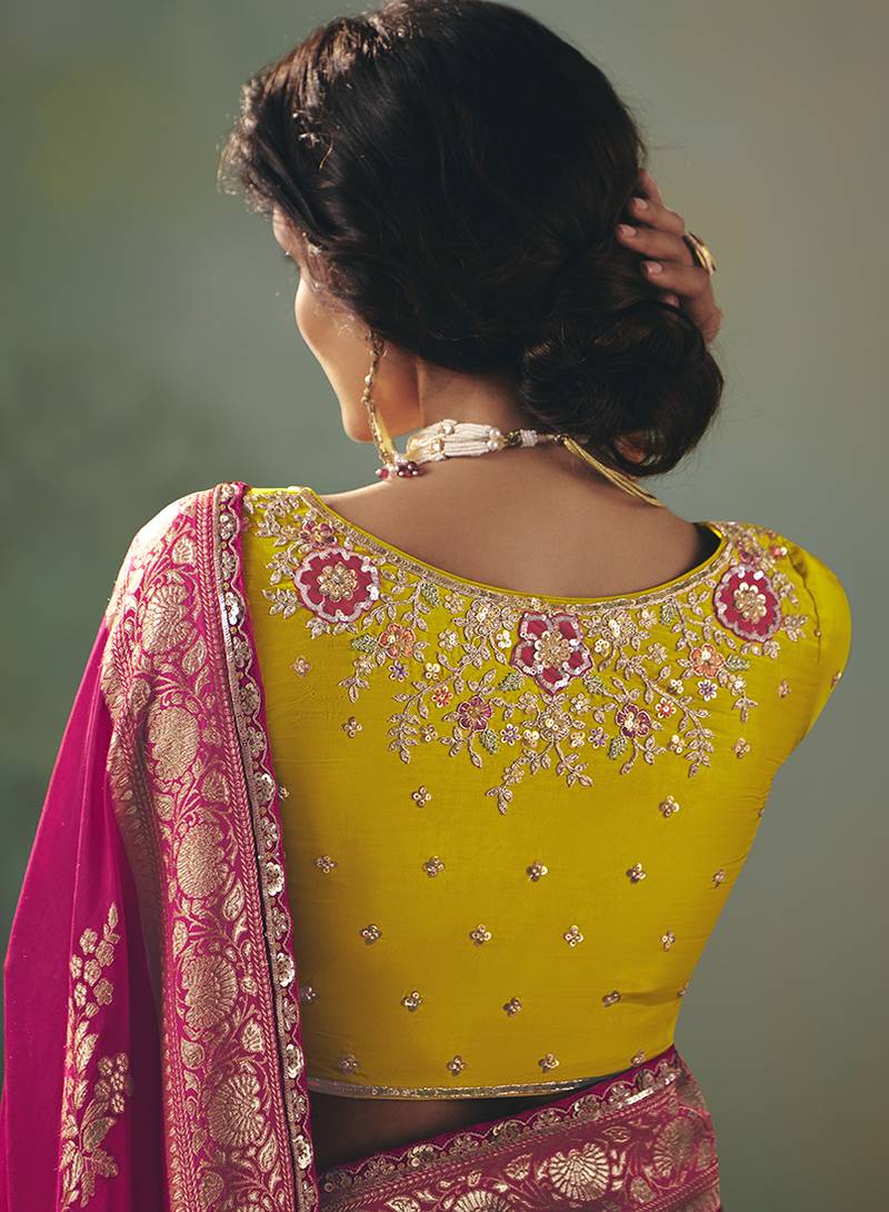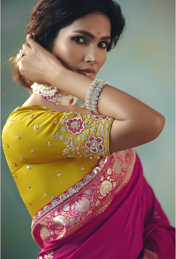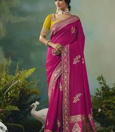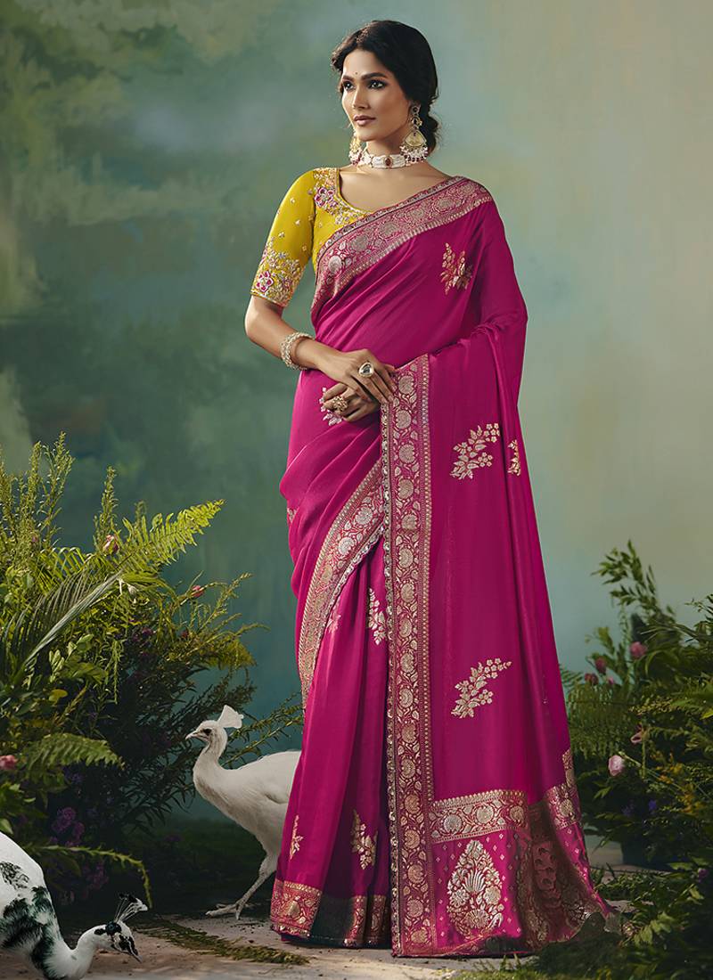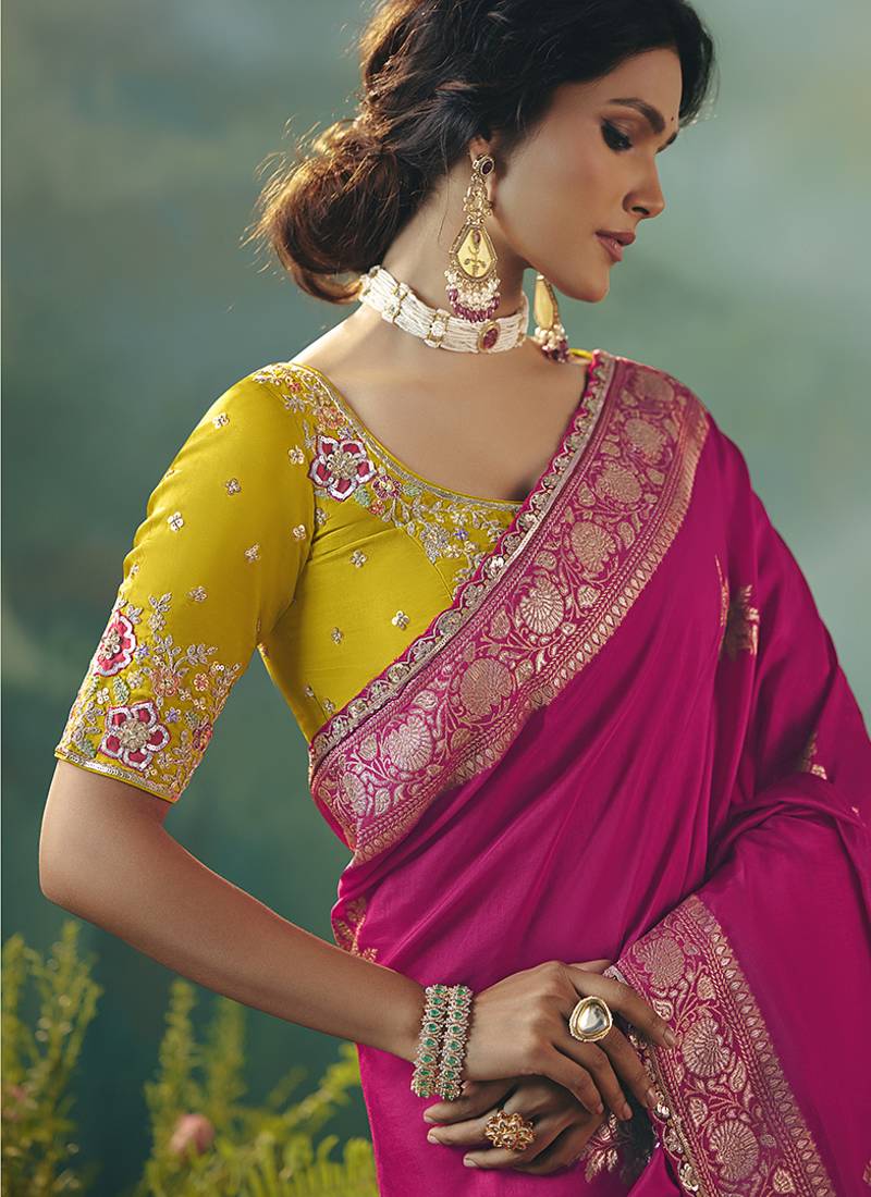 Rani pink dola viscose silk saree with zari weaving & sequence work blouse