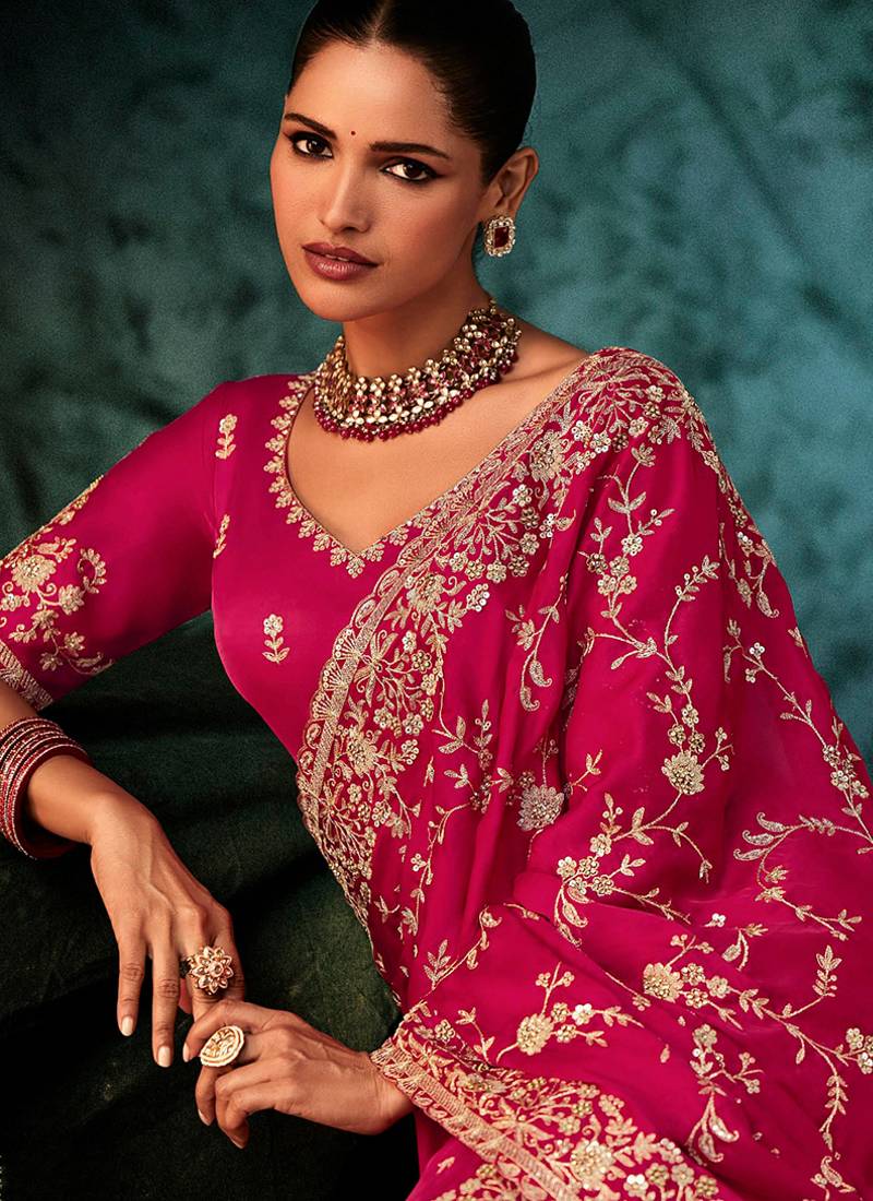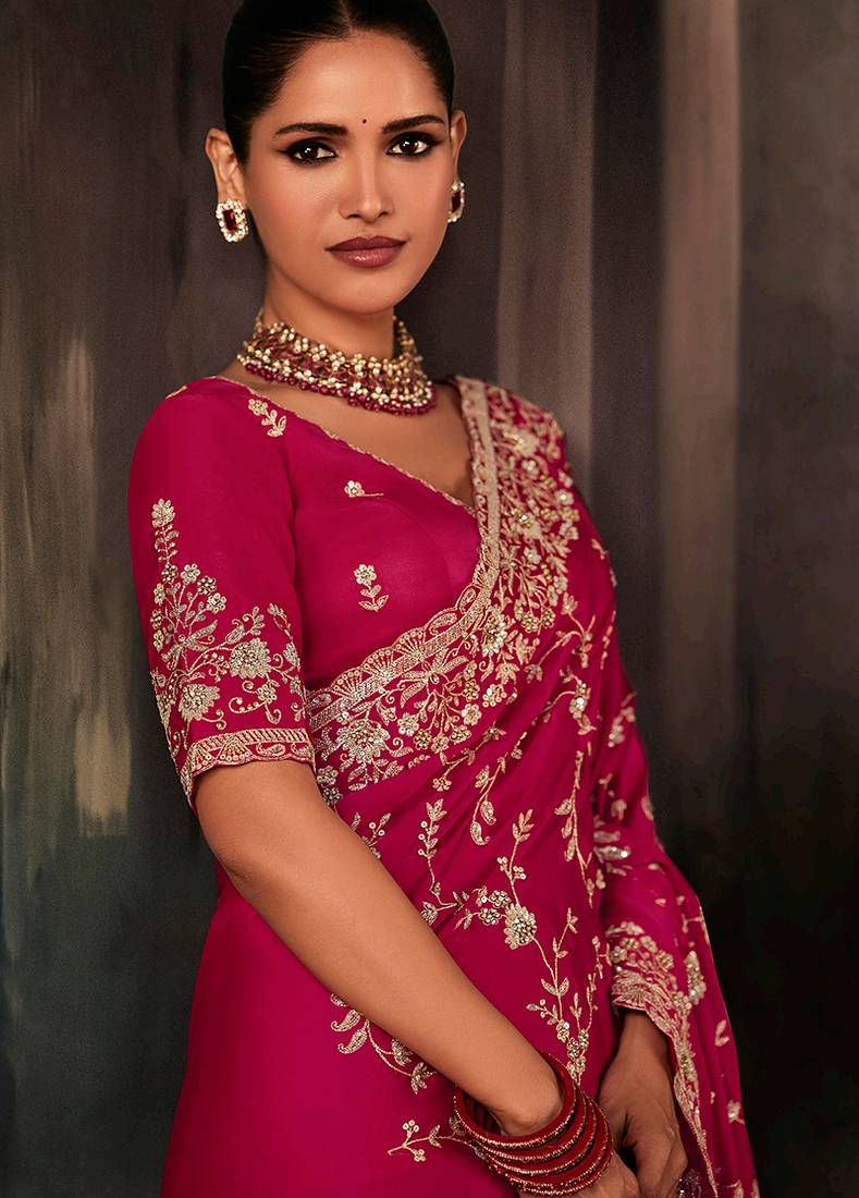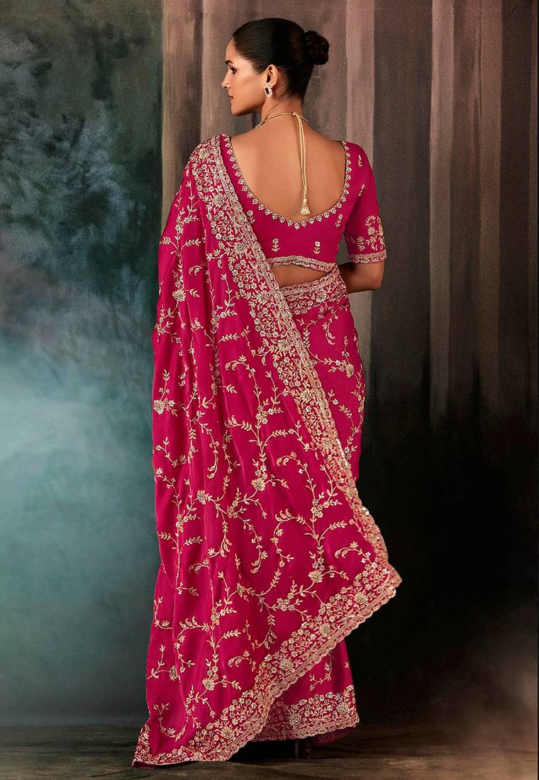 Rani pink faux satin embroidery bridal reception festival wedding wear heavy border saree