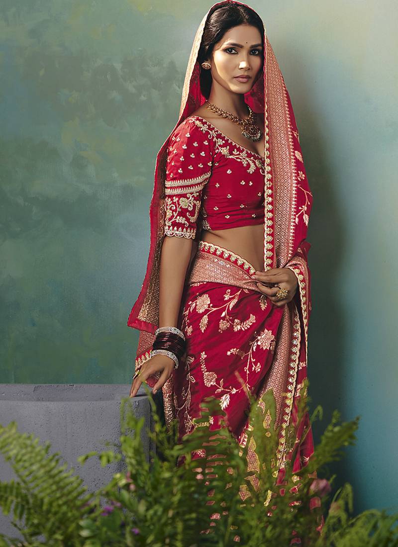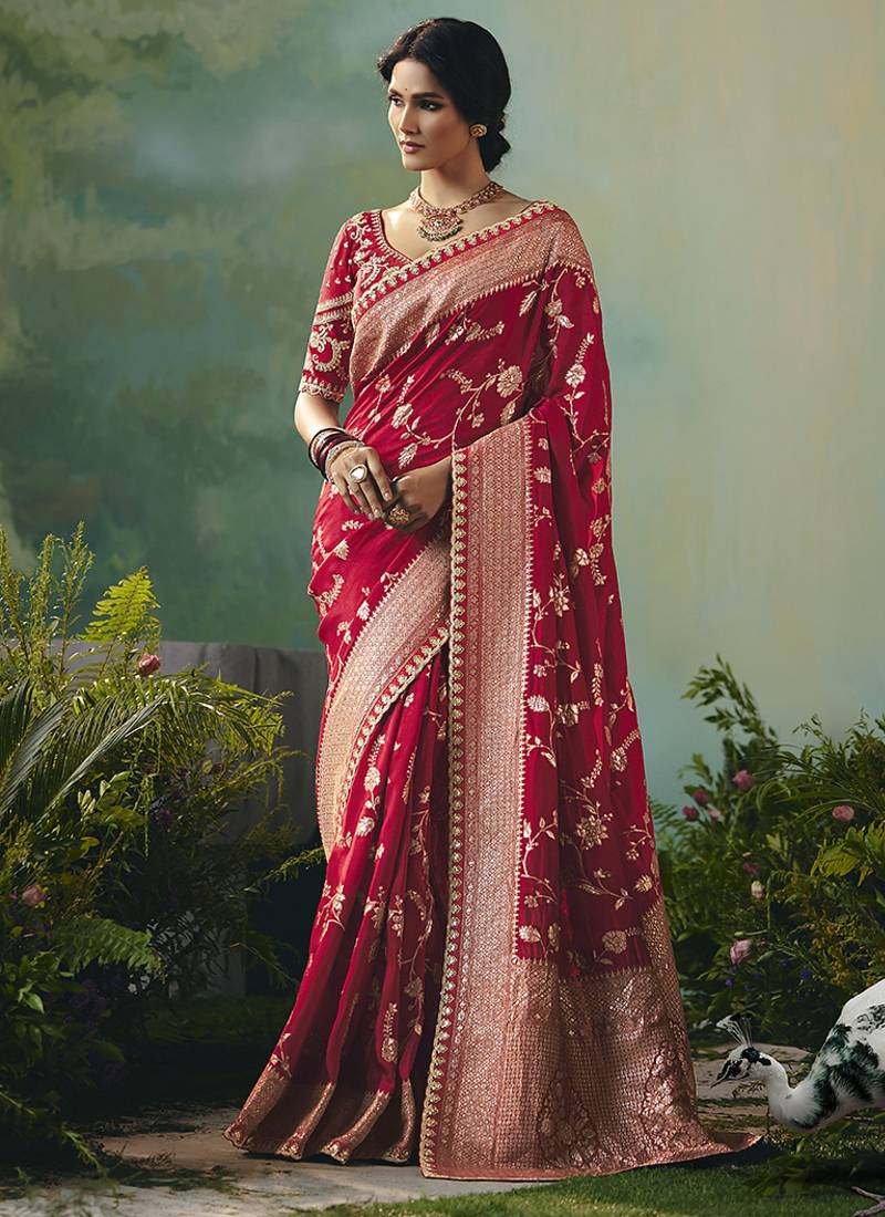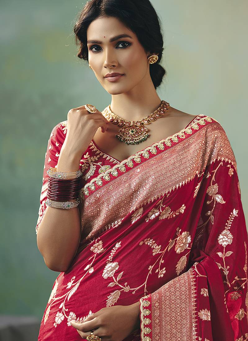 Red dola viscose silk saree with zari weaving & sequence work blouse