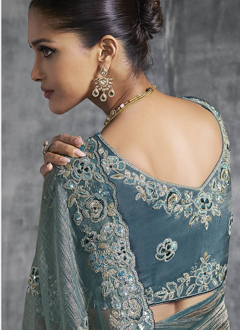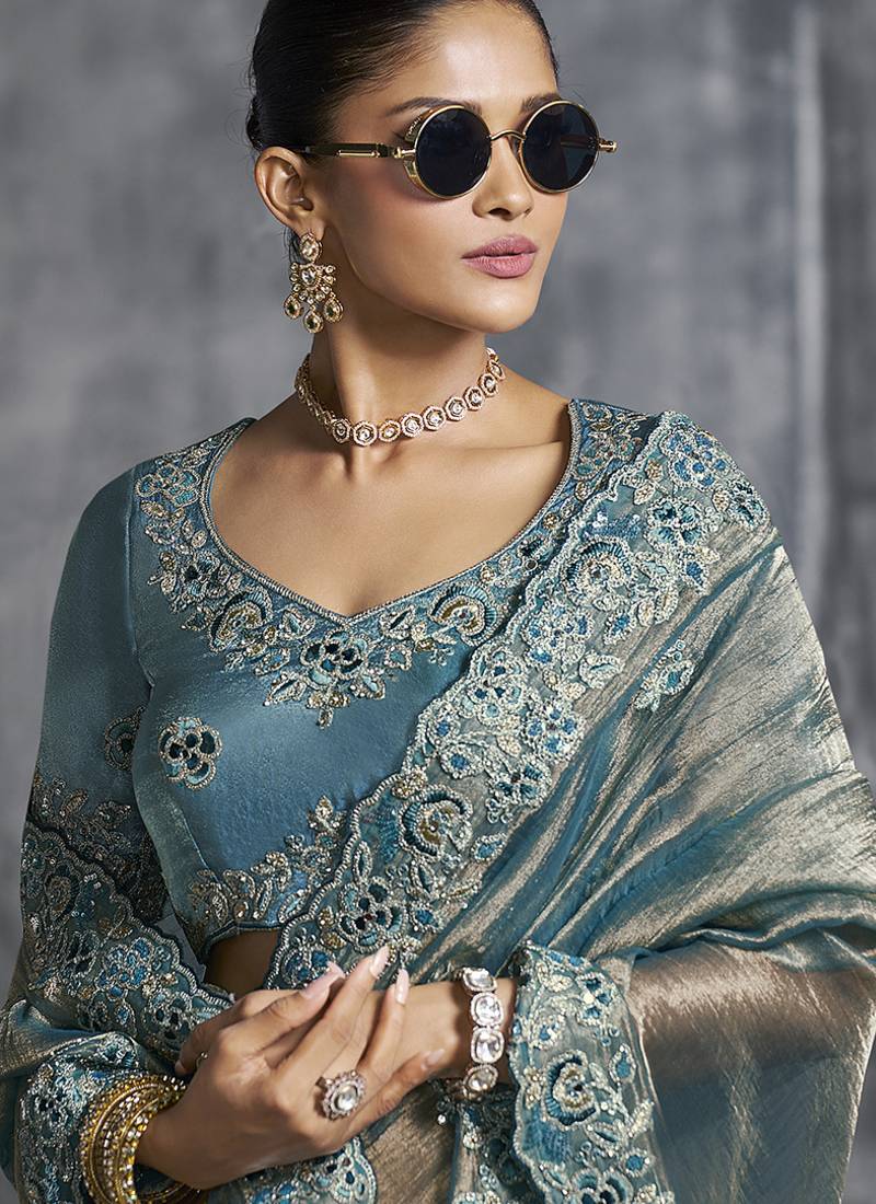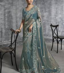 Product Name | Teal Blue Tissue Traditional Saree With Embroidered, Resham And Thread Work For Ceremonial | |