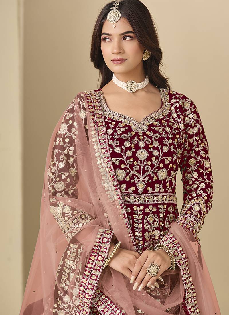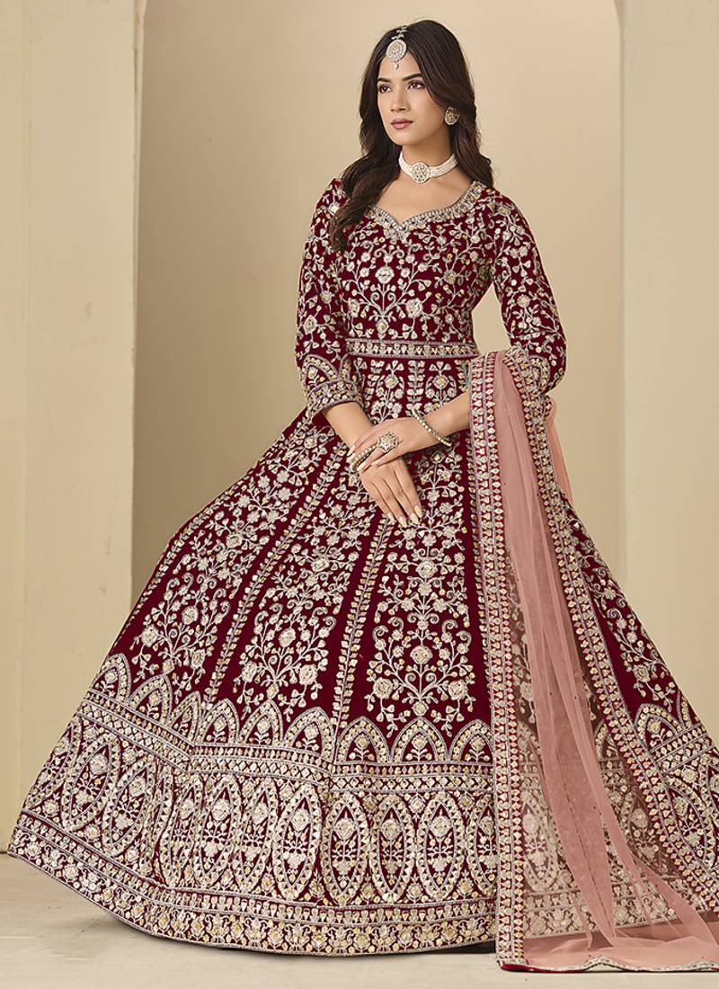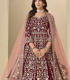 Velvet embroidered maroon engagement wear anarkali suit semi stitched