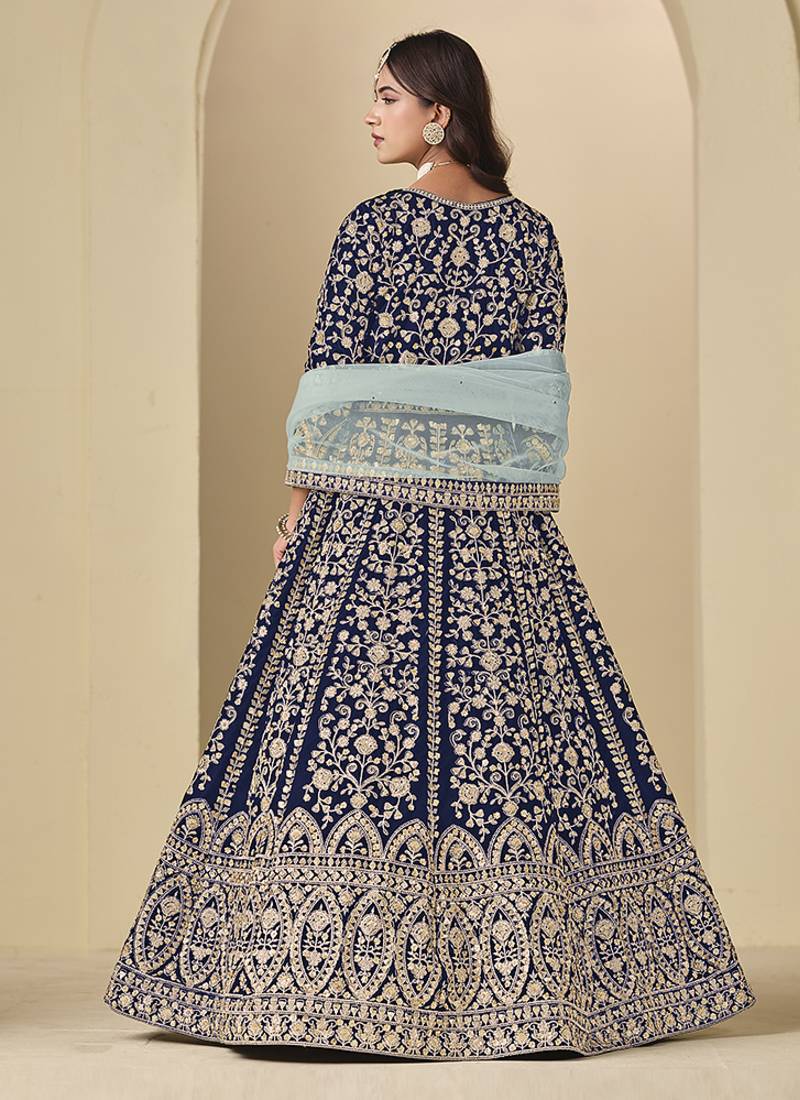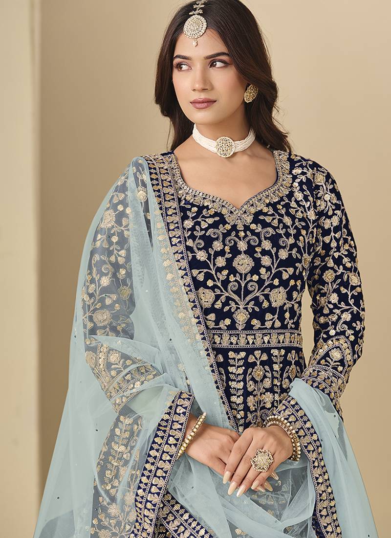 Velvet embroidered navy blue engagement wear anarkali suit semi stitched