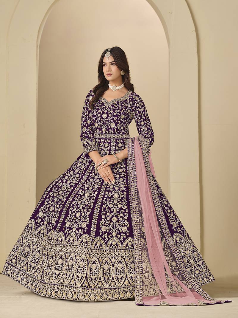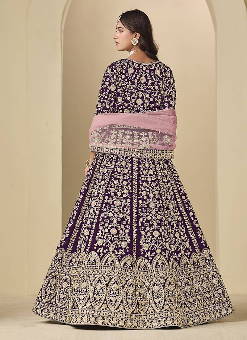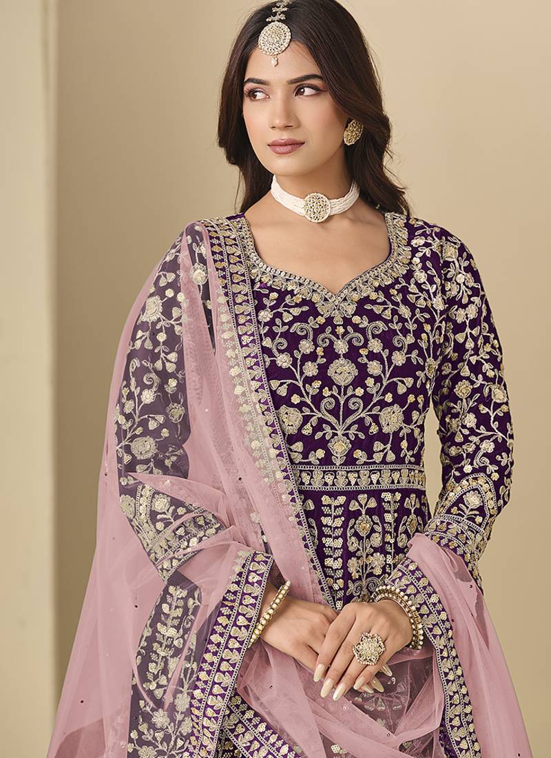 Velvet embroidered purple engagement wear anarkali suit semi stitched