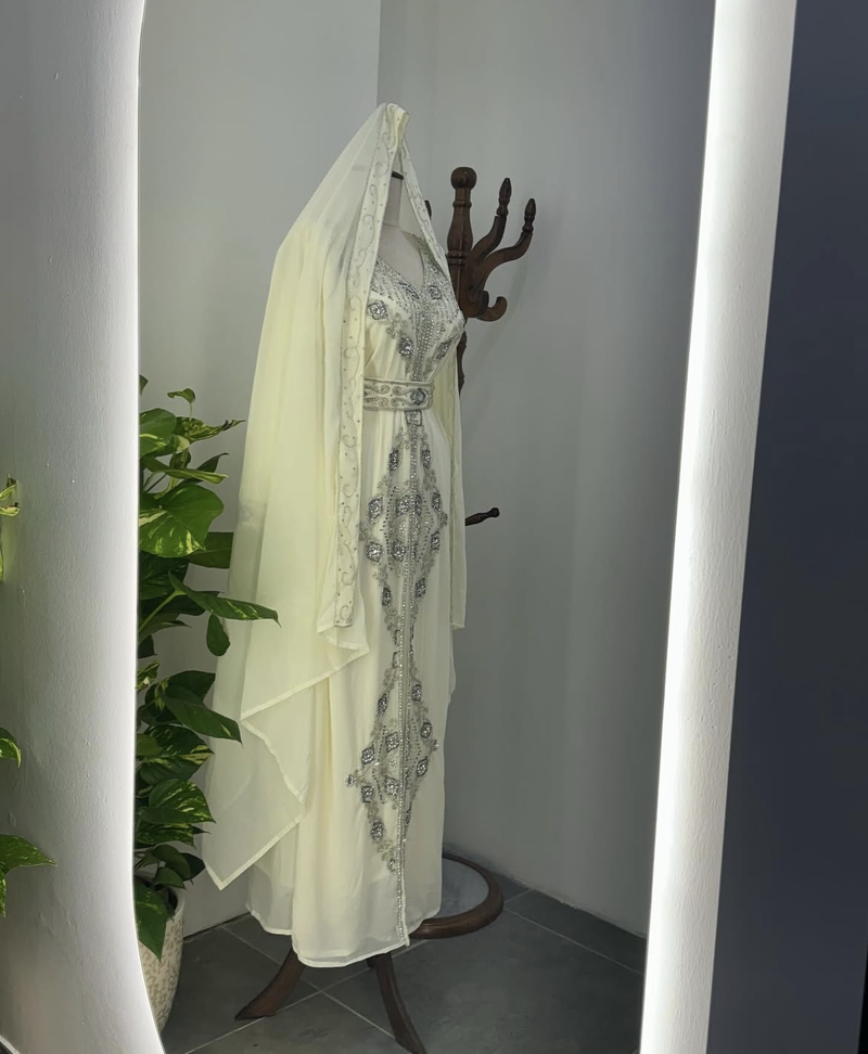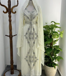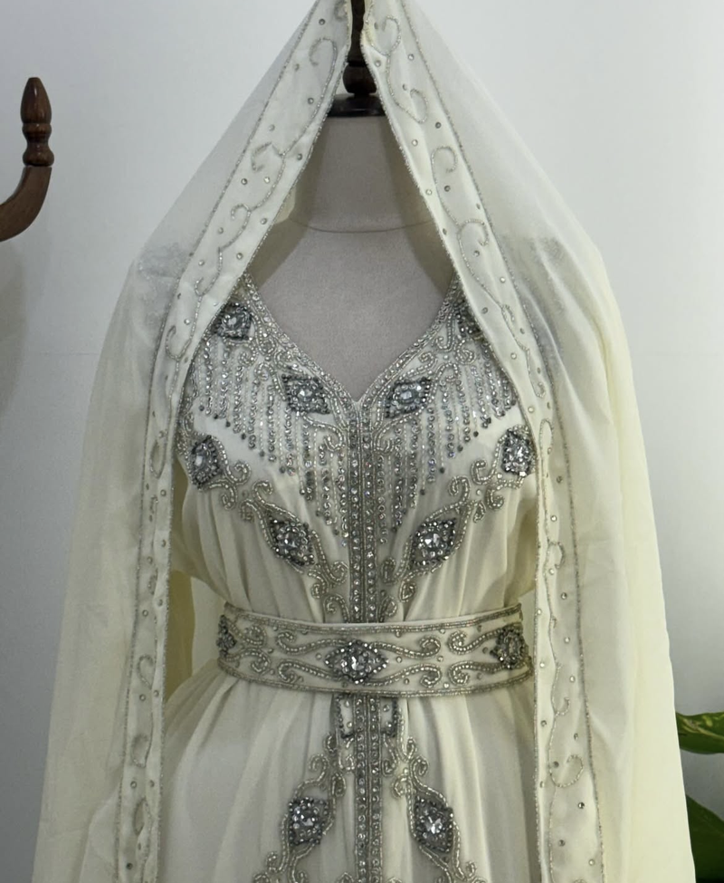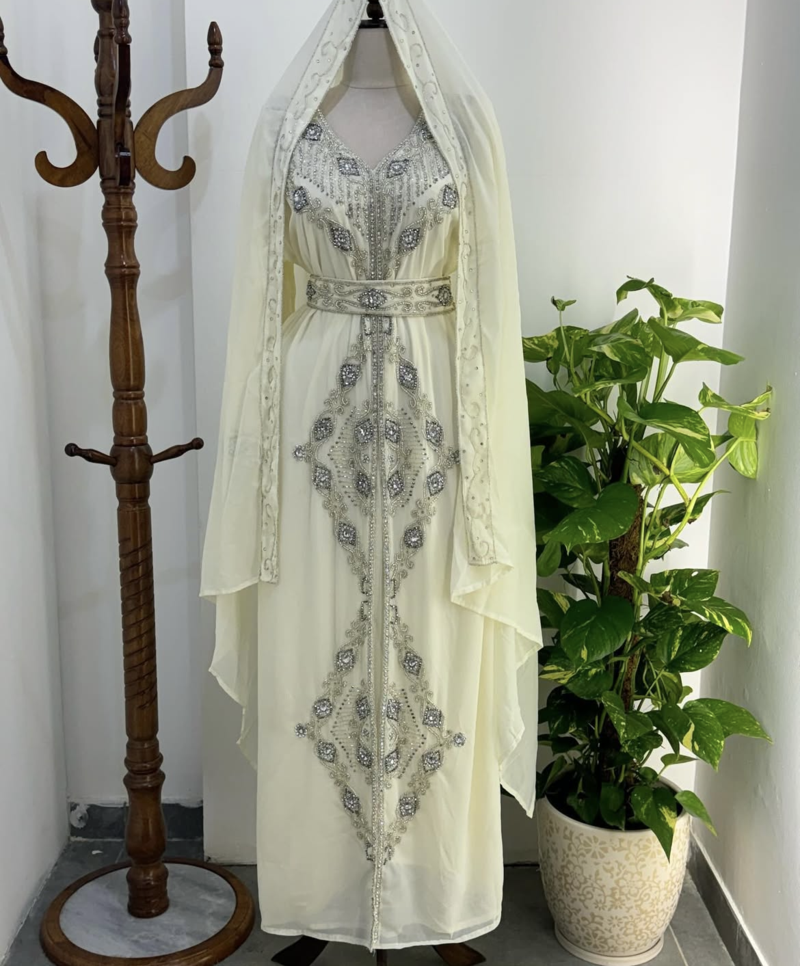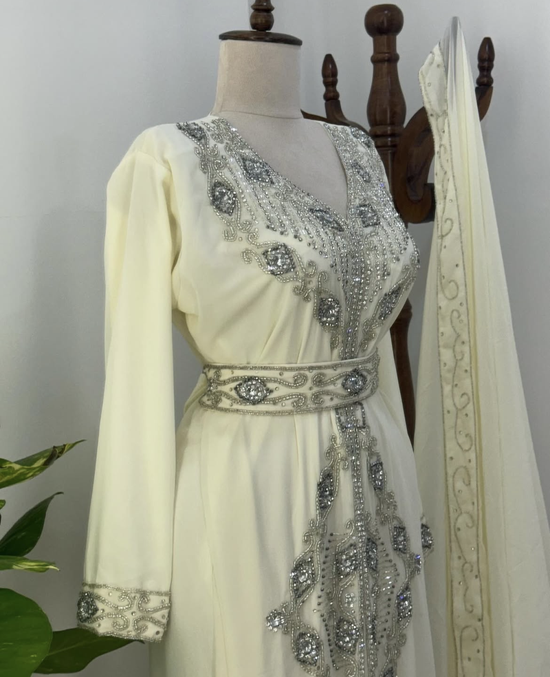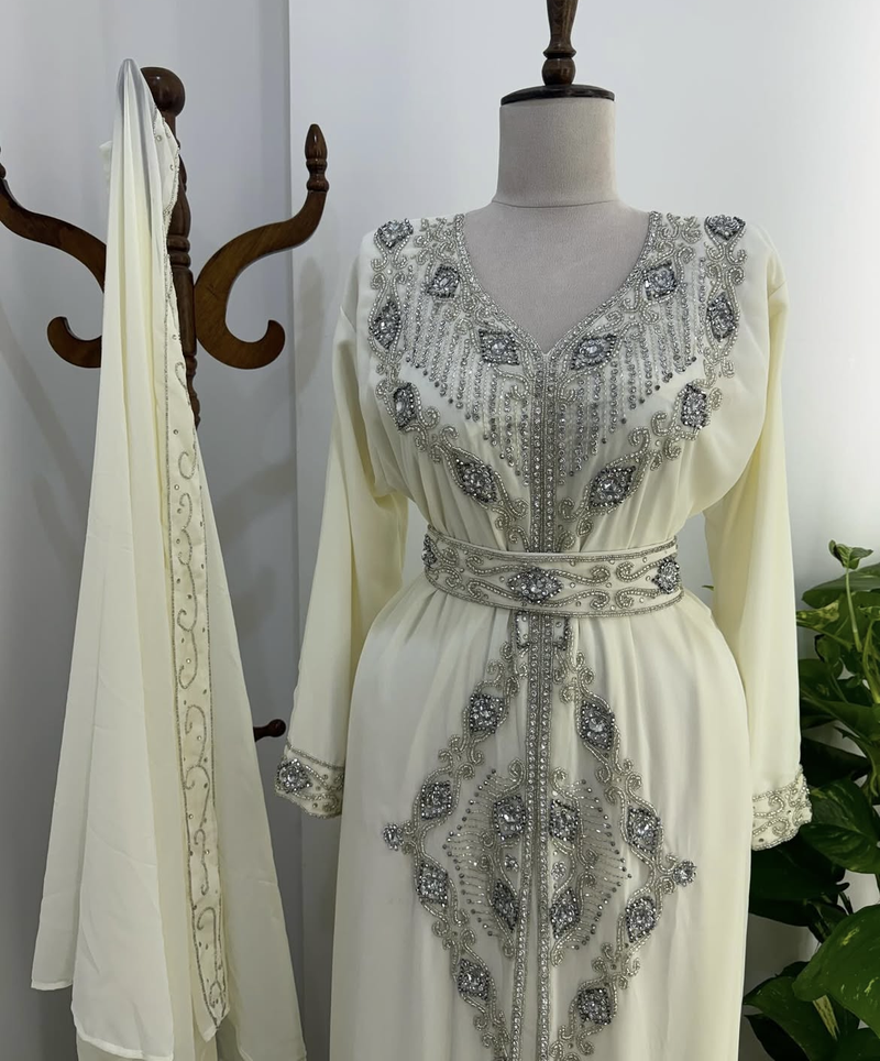 Step Into Timeless Elegance With This Stunning White Embroidered Kaftan, Beautifully Crafted For Women Who Love A Touch Of Royalty. Designed With Intricate Silver Embroidery And Sparkling Stone Work, This Kaftan Adds A Graceful Shimmer That Makes It Perfect For Festive Events And Celebrations. The Flowy Fabric Drapes Effortlessly, Giving A Luxurious And Modest Look Suitable For Weddings, Eid Gatherings, Or Evening Parties.