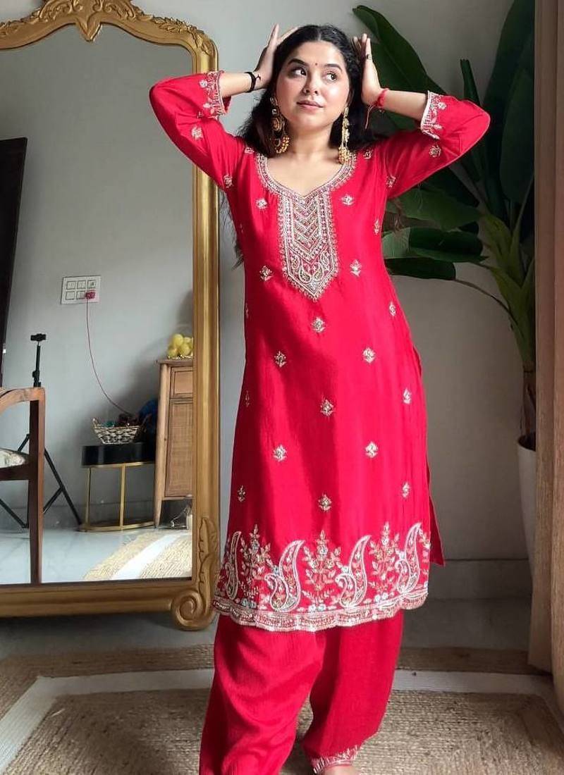 Red chinon embroidered salwaar suit
