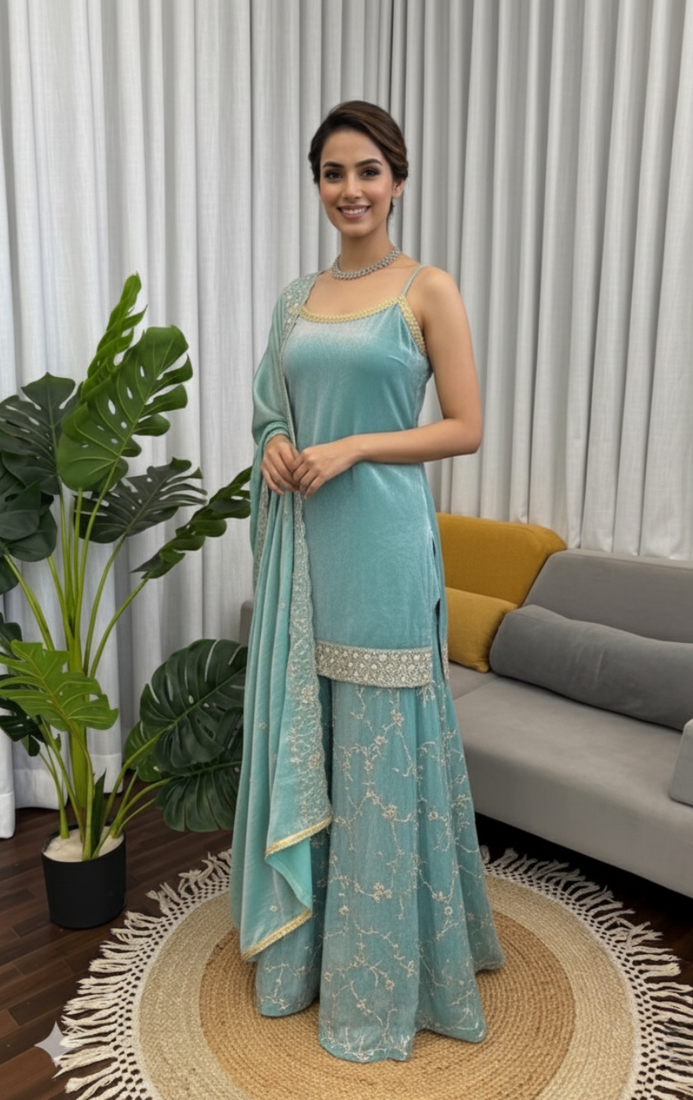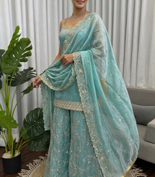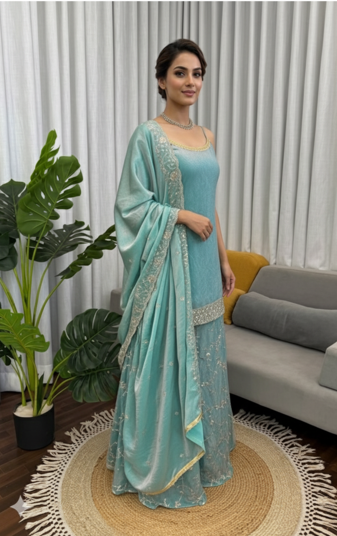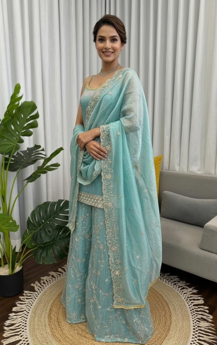 | Product Name | Sky Blue Embroidered Fendy Silk Kurta Palazzo Set | |