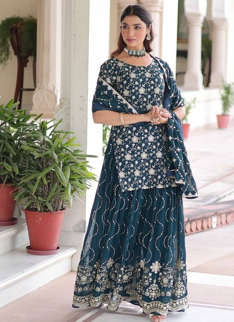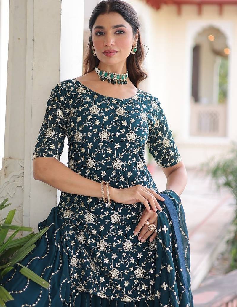 | Product Name | Turquoise Georgette Sequins Embroidered Kurti Sharara Set | |